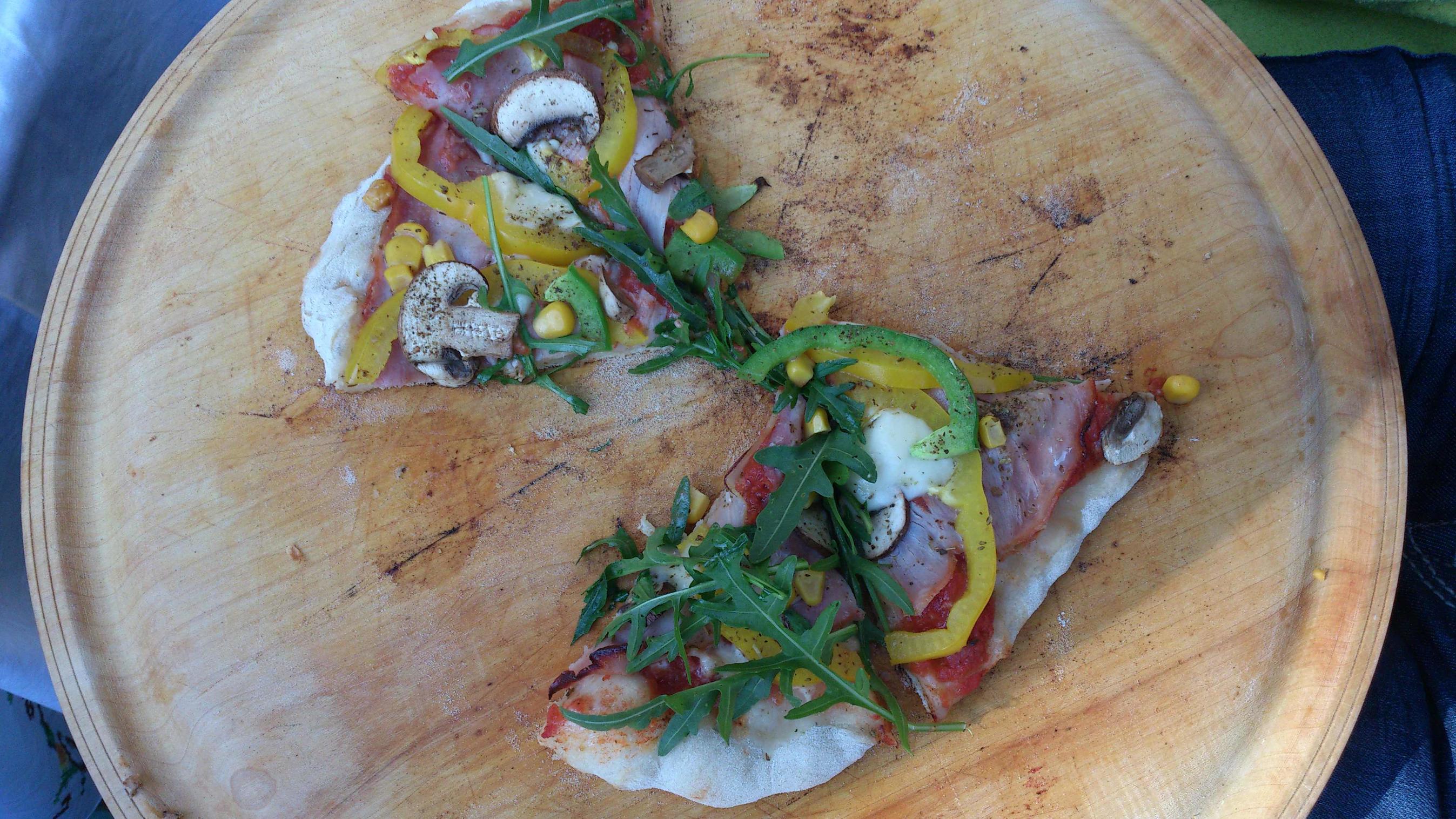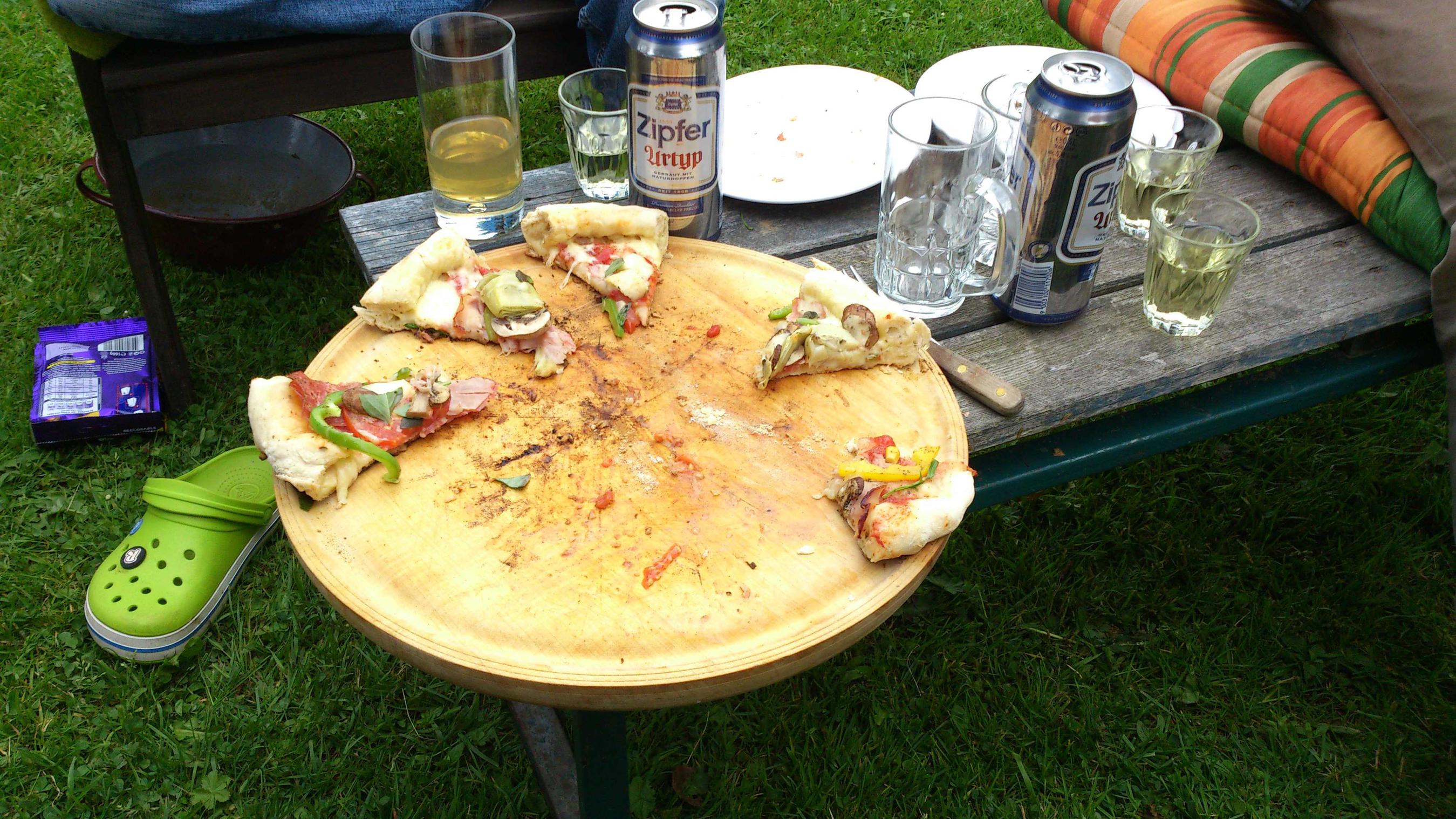 Dass ganze wurde einfach wild im Garten gegessen. Jede Pizza hat zirka 8 Minuten im Grill bei 250-270 °C gebraucht.