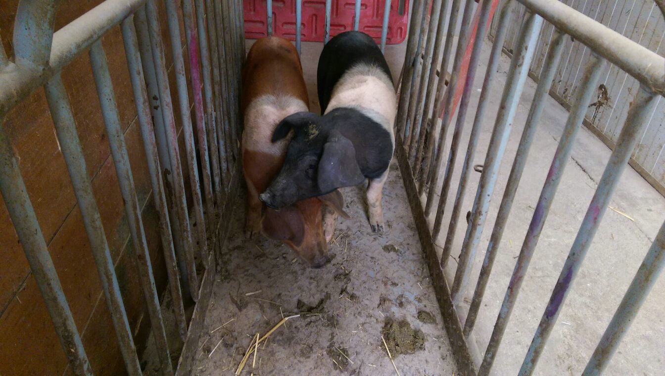 Wir haben ihm für seinen neuen Stall 2 Schwäbisch-Hällische Landferkerl gekauft; Die sind ja putzig
