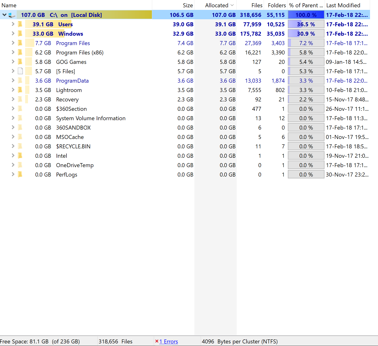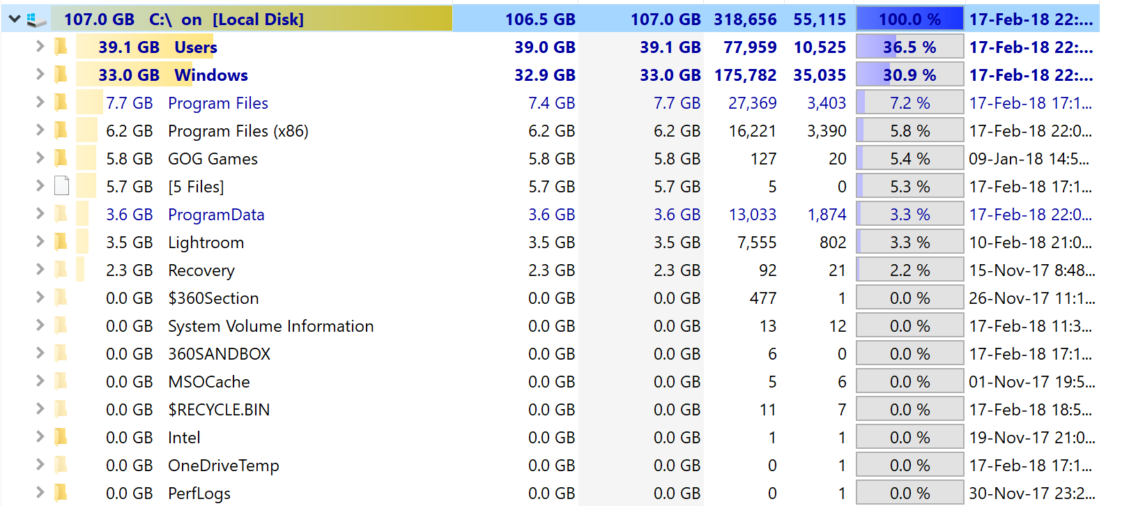 ich wollte zum einen nachfragen, wie groß aktuell Windows 10 Pro 64 bit ist und zum anderen, wie es sein kann, dass mir die Software "TreeSize" anzeigt, dass ich auf meiner 256 GB großen SSD 107 GB benutze, ich aber nur noch 81 GB zur freien Verfügung habe?