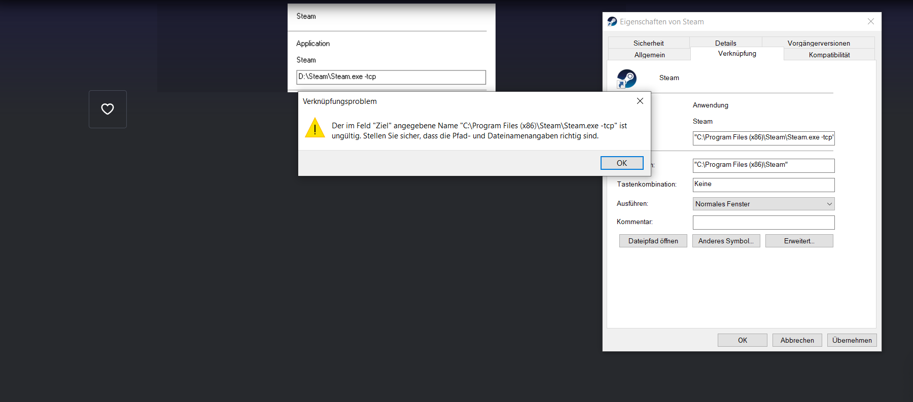 er hängt an die verknüpfung von steam ein -tcp an wie hier auf dem bild: