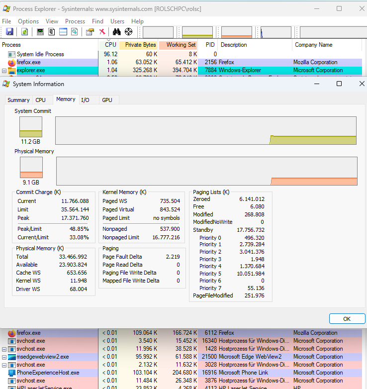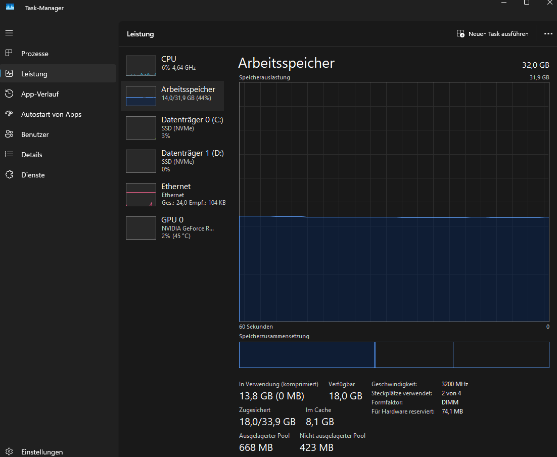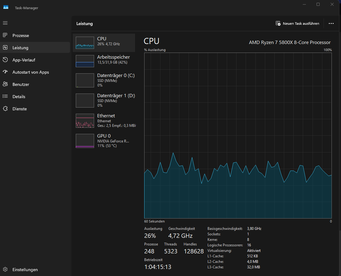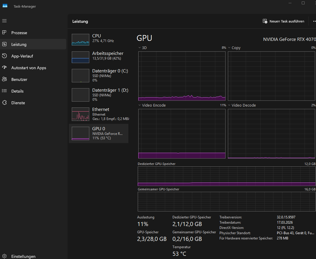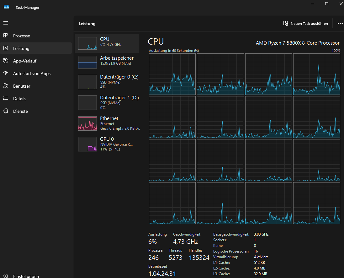 Was mich besonders wundert: Laut Task-Manager ist die Auslastung dabei relativ gering. Die CPU liegt meist nur bei etwa 20–30 %, die GPU sogar nur bei ca. 5–10 %. Trotzdem treten genau in diesen Lastsituationen die starken Einbrüche auf.