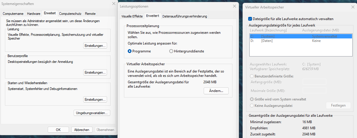 ja so ist es auch eingestell. also leider auch kein trefferLuftgucker schrieb:Unter erweiterte Systemeinstellungen kannste die Auslagerungsdatei checken. So sieht es standardmäßig aus und so sollte es auch eingestellt werden::