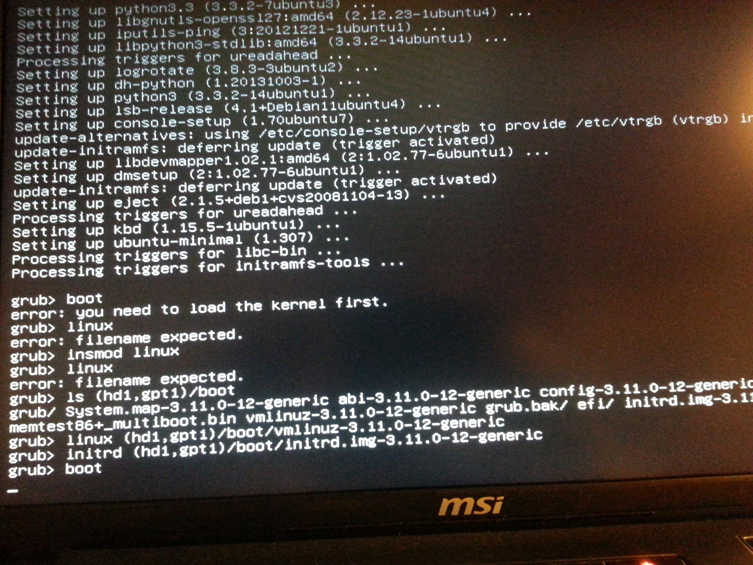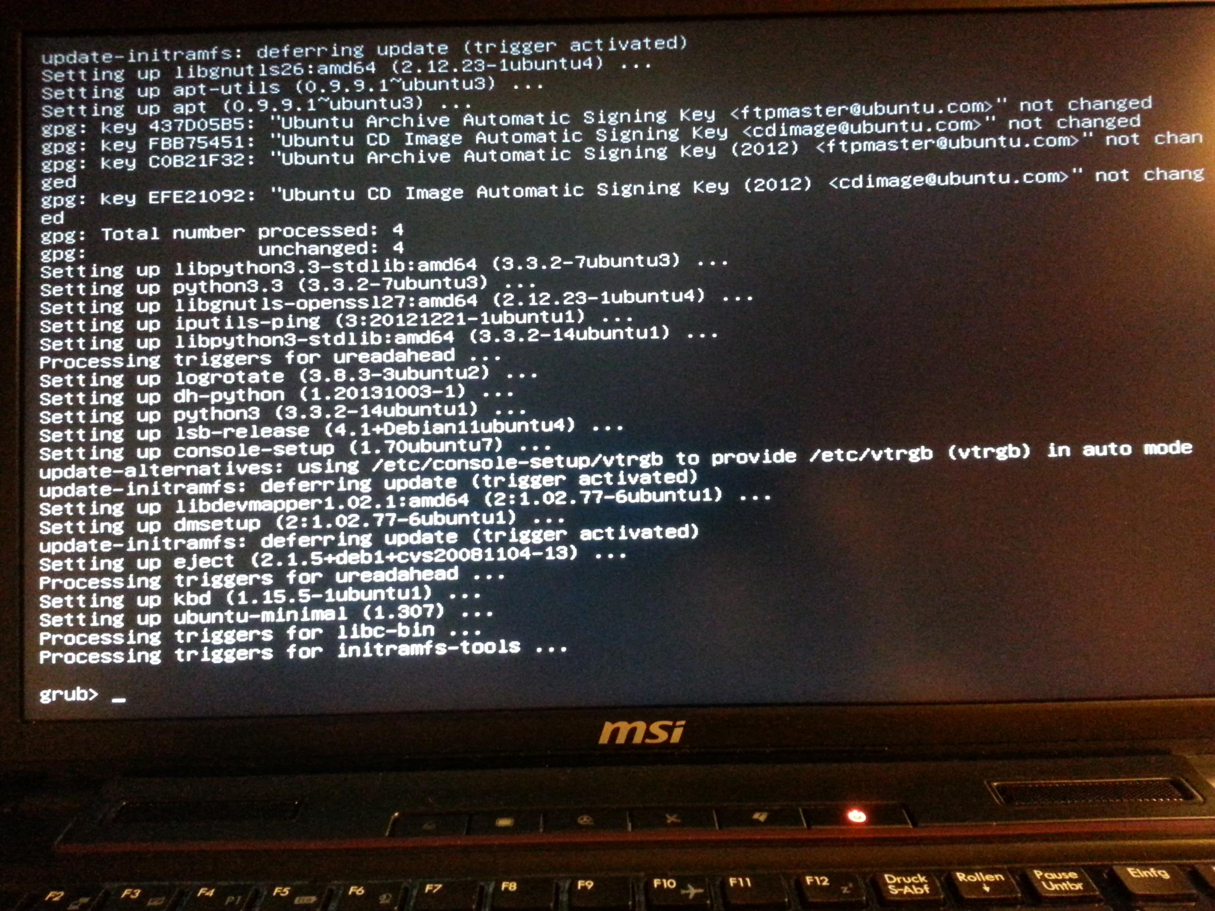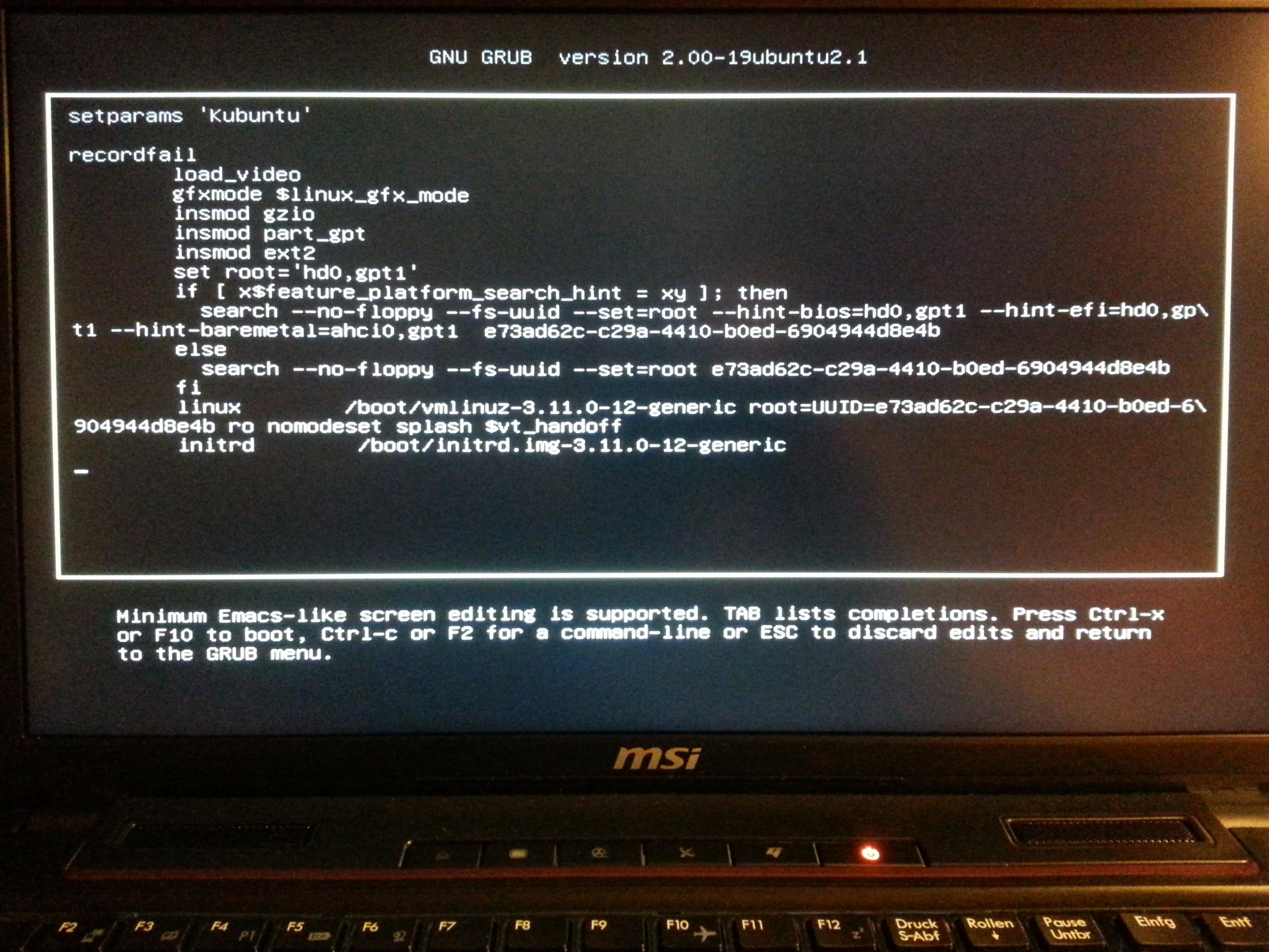 ich muss mich mal wieder an euch melden. Ich habe ein MSI GP 60 und dazu eine SSD 840 evo. Ich hab kubuntu installiert gehabt, hab meine Partitionen angelegt. Installation war erfolgreich. Nach dem neustart "no media found". Ich kannte das Problem mit Grub per USB schon von meinem letzten Rechner, deswegen hab ich boot repair disk eingelegt und mit den default einstellungen grub neuinstalliert. Nach dem neustart dann kam auch grub, ich hab kubuntu ausgewählt, schwarzer bildschirm, freeze. Ich nahm an, es ist was schief gegangen, also boot reihenfolge wieder auf live cd, grub 2 kam, ich hab try kubuntu ausgewählt ... schwarzer bildschirm, freeze. Hab das ganze dann mit ubuntu probiert. Immer noch freeze. Im UEFI Mode ist nach grub immer schluss, egal ob per live cd oder von der harddisk aus. Im Legacy mode kam ich weiter, hab dann von dort aus wieder versucht, grub herzustellen. Leider ohne erfolg. Es wurde eine summery erstellt, diese ist hier: