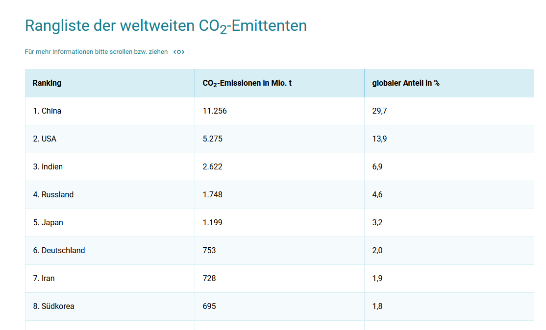 Der weltweite CO2-Ausstoß hat 2023 einen Wert von 39,0 Milliarden Tonnen erreicht. Für 83 % dieser Emissionen waren die G20-Staaten verantwortlich.