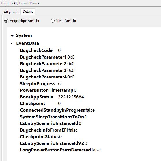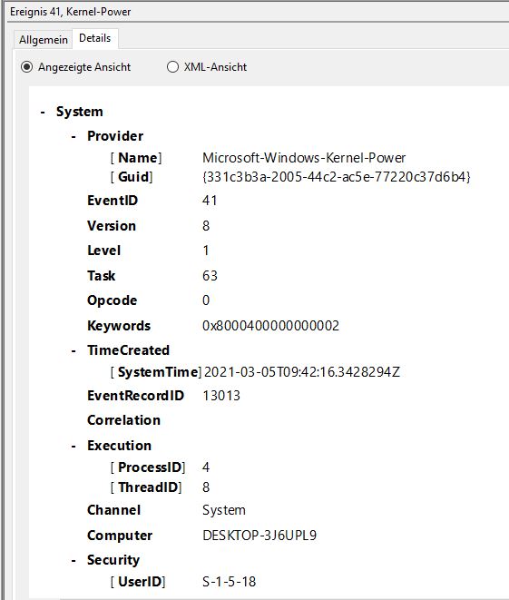 Ich habe seit einigen Tagen das Problem das mein PC egal ob unter Last oder nicht einfach Neustartet. Gestern hatte ich den Fehler 1x nach 7h Nutzung. Einen Tag zuvor genau das selbe bereits nach 2h Nutzung. Komischerweise hatte ich gestern und heute auch den Fall das er mir auf meinen Monitoren Blackscreen ausgibt aber noch normal weiterläuft (LED´s und Lüfter laufen) erst durch abschalten am Netzteil lässt er sich ausschalten. Auch der Ein/Aus Taster funktioniert nicht wenn ich Blackscreen habe. In der Ereignisanzeige protokolliert er mir nur den Fehler "Kernel Power" (Ereignis ID: 41), ich hänge hier mal ein Bild des Fehlers an vlt. kann damit jemand mehr anfangen als ich.