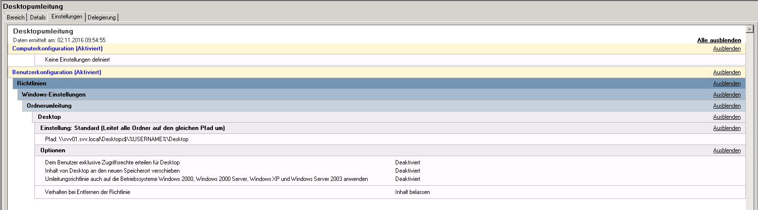Ich habe per GPO eine Desktopumleitung auf \\server.domain.local\Desktops$\%USERNAME%\Desktop eingerichtet, welche unter allen Windows 7 Clients ohne Probleme funktioniert. Auf der Win10 Maschine wird der Pfad aber komplett falsch angegeben.