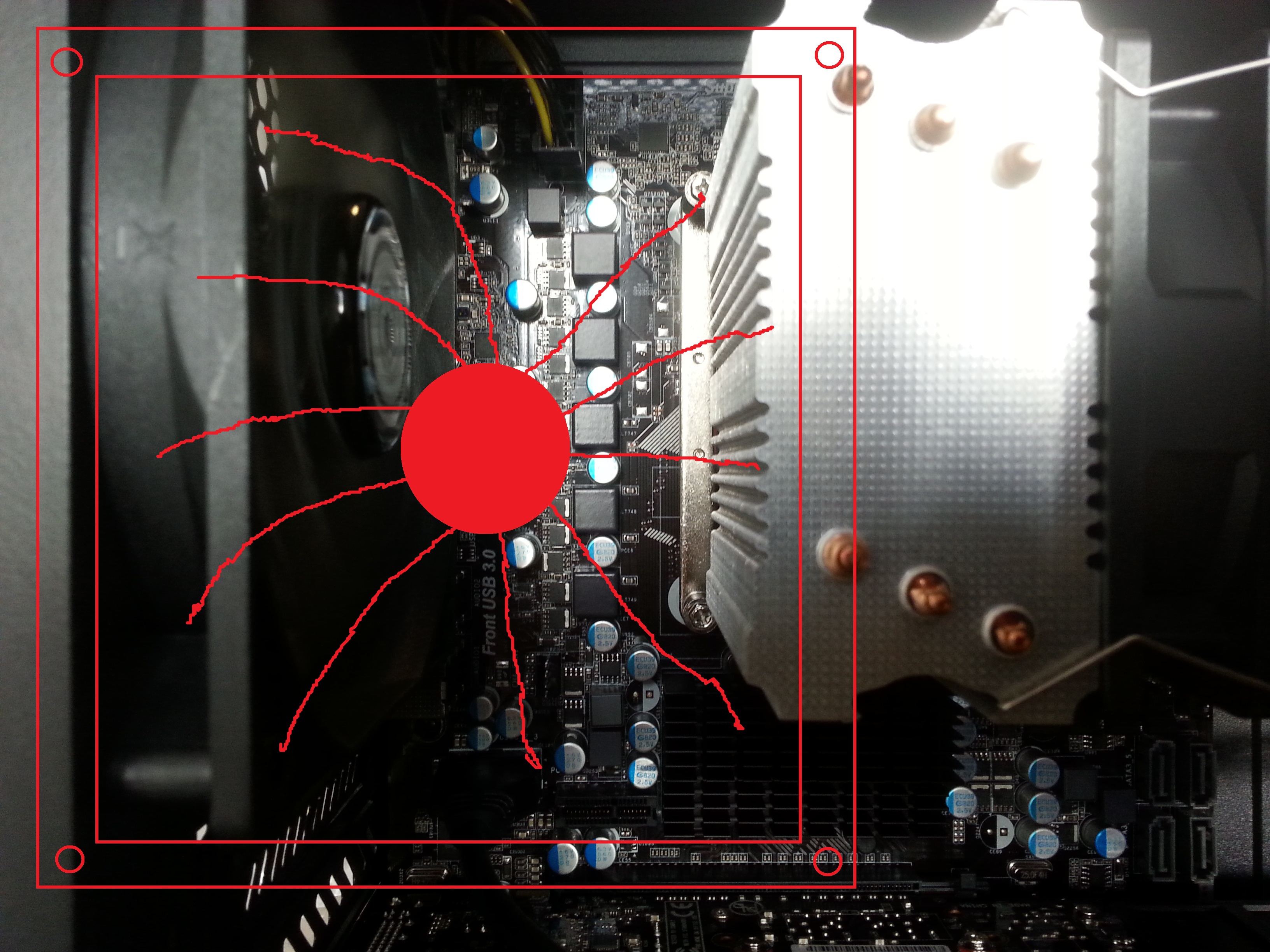 Sorry aber das ist totaler Mist was ihr hier einem Laien sagt. Ein Tower braucht nunmal einen Lüfter um die Warme Luft aus dem Ghäuse raus zu Pusten! Glaubt ihr wirklich das wenn ein Spannungswandler bei einem Gut gelüfteten Gehäuse überhitzt und das Problem dann weg geht wenn ihr den Tower noch mehr überhitzt weil die Warme Luft nicht mehr abgeführt wird? Vorallem sieht es so aus als Pustet der CPU Lüfter Richtung hinteren Tower Lüfter und den wollt ihr dann umdrehen? Damit der Luftstrom so richtig fürn Arsch ist?