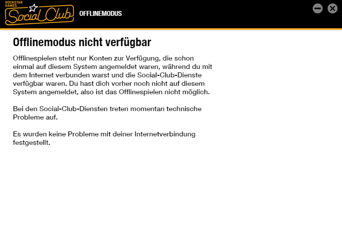 Ich habe bei GTA V schon lange das Problem, dass wenn ich es starte, immer eine Meldung kommt, dass keine Verbindung zu den Rockstar-Servern hergestellt werden konnte und ich meine Verbindung prüfen solle(habe ich getan!). Ich habe sehr lange versucht das Problem zu lösen, jedoch ohne Erfolg. Letzlich habe ich das Spiel nun ganz deinstalliert und mit den CD's neu installiert. Das Kopieren von den Datenträgern war erfolgreich, jedoch wenn ich GTA V starte um die letzten 5 GB's herunterzuladen kommt wieder dieselbe Fehlermeldung... Ich finde das komisch weil ich früher ohne Probleme spielen konnte und plötzlich nach einem Update dieses Problem erscheint. Es funktioniert nicht einmal nach eine Neuinstallation. Ich habe auch schon den Virenscanner(AVG) deaktiviert und die Firewall ausgeschaltet jedoch ohne Ergebnisse.