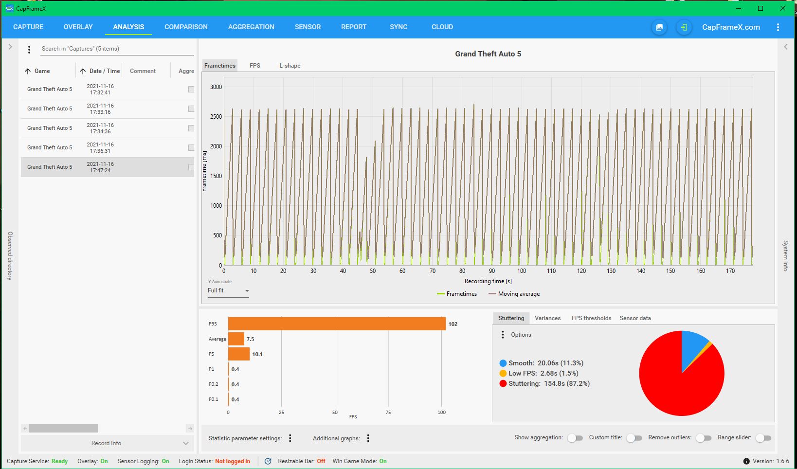 Hier sind die Ergebnisse von CapFrameX, Erst im Ladescreen und dann noch während des Spiels