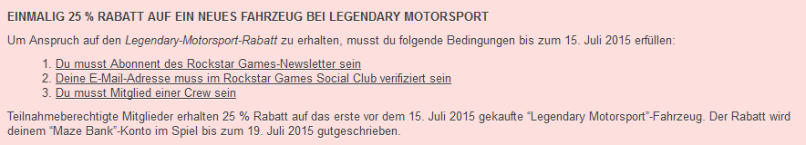 Für alle die es interessiert: Bei Legendary Motorsport gibt es aktuell eine 25% Rabattaktion auf das erste gekaufte Fahrzeug anlässlich des neuen Updates. Die Aktion ist aber an Bedingingen geknüpft. (siehe Screenshot)