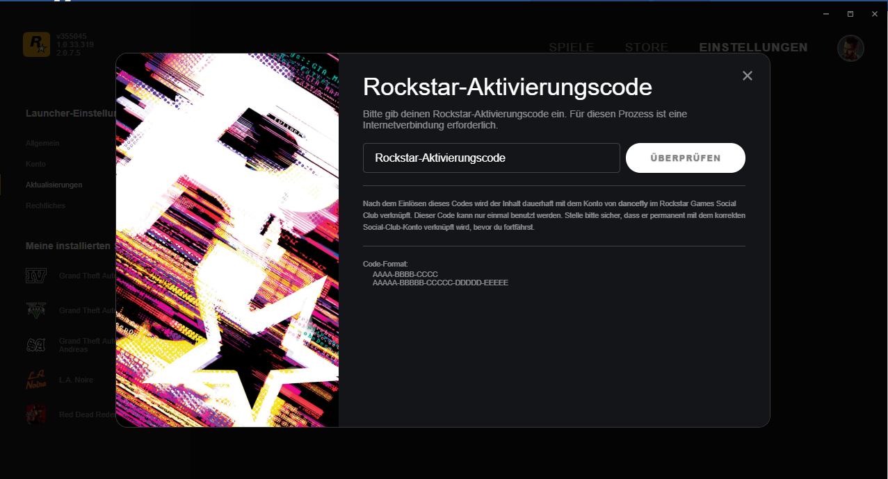Gehe auf https://de.socialclub.rockstargames.com/ und logge dich mit deinem Account ein, oder erstelle einen. Als nächstes klickst du rechts oben auf die Optionen und wählst "Spiele-Downloads" aus. Die folgenden Spiele werden dir angezeigt darunter auch GTA V. Klicke auf "Rockstar-Code verwenden" und tippe danach deine Code in die Spalte ein. Sobald du das getan hast,klicke auf "Aktivieren" und du kannst das Spiel herunterladen.
