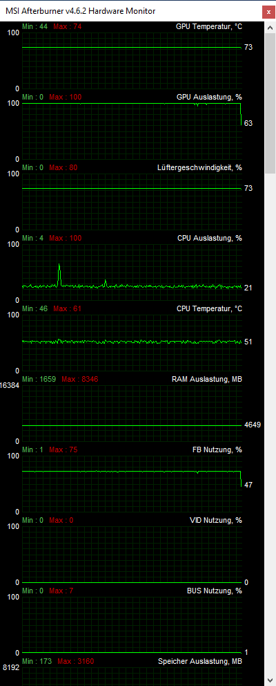 Das merkwürdige daran ist, dass die Lüftergeschwindigkeit dann in MSI Afterburner trotzdem 0% ausgibt. Versuche ich die Lüftergeschwindigkeit manuell zu steuern, wenn der Lüfter noch aus ist, geht er sofort mit voller Geschwindigkeit an, selbst wenn ich die Geschwindigkeit auch nur auf 25% einstelle. Stelle ich wieder Auto ein, passiert nichts und er geht auch bis zu einem Neustart nicht mehr aus.