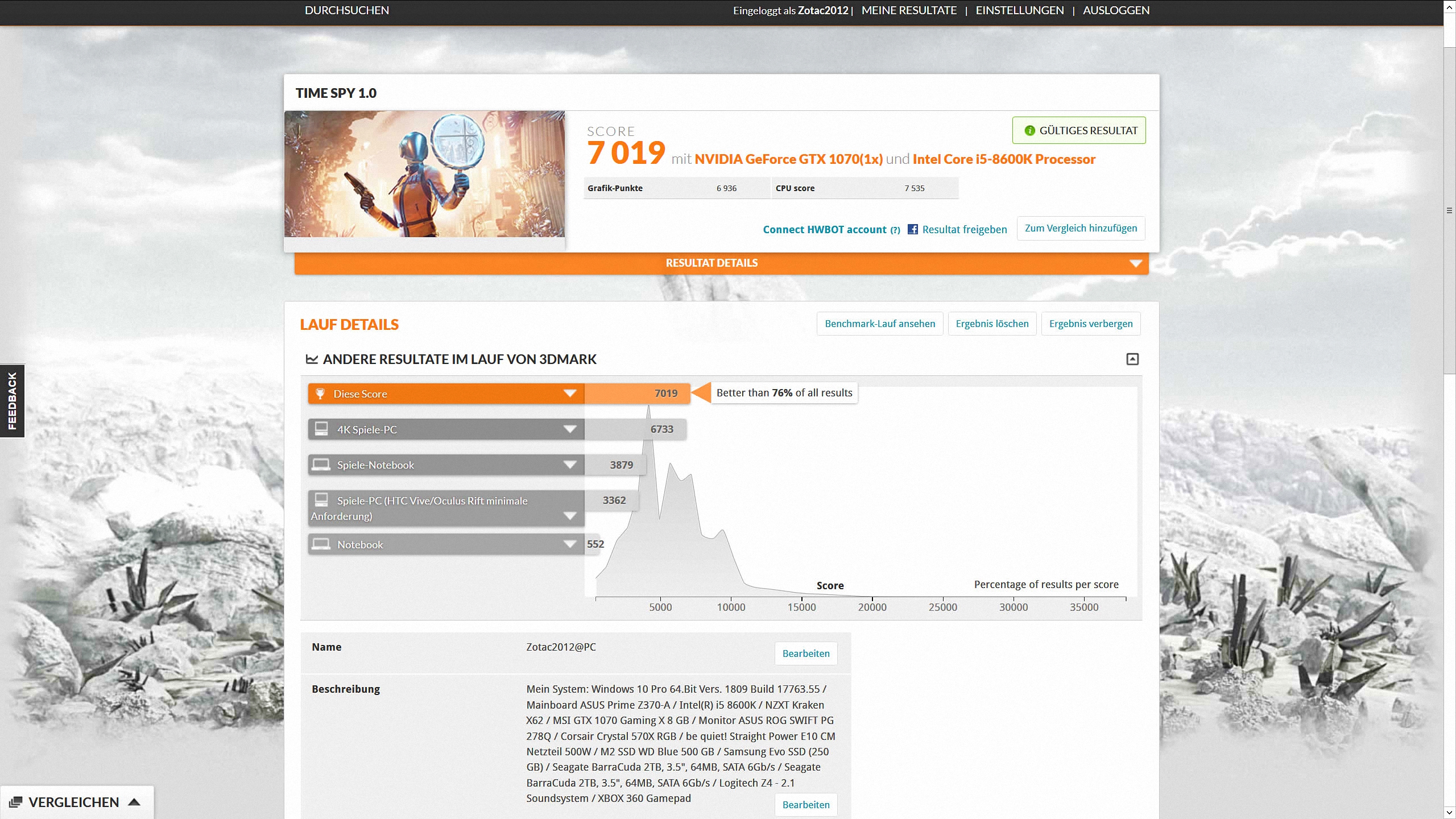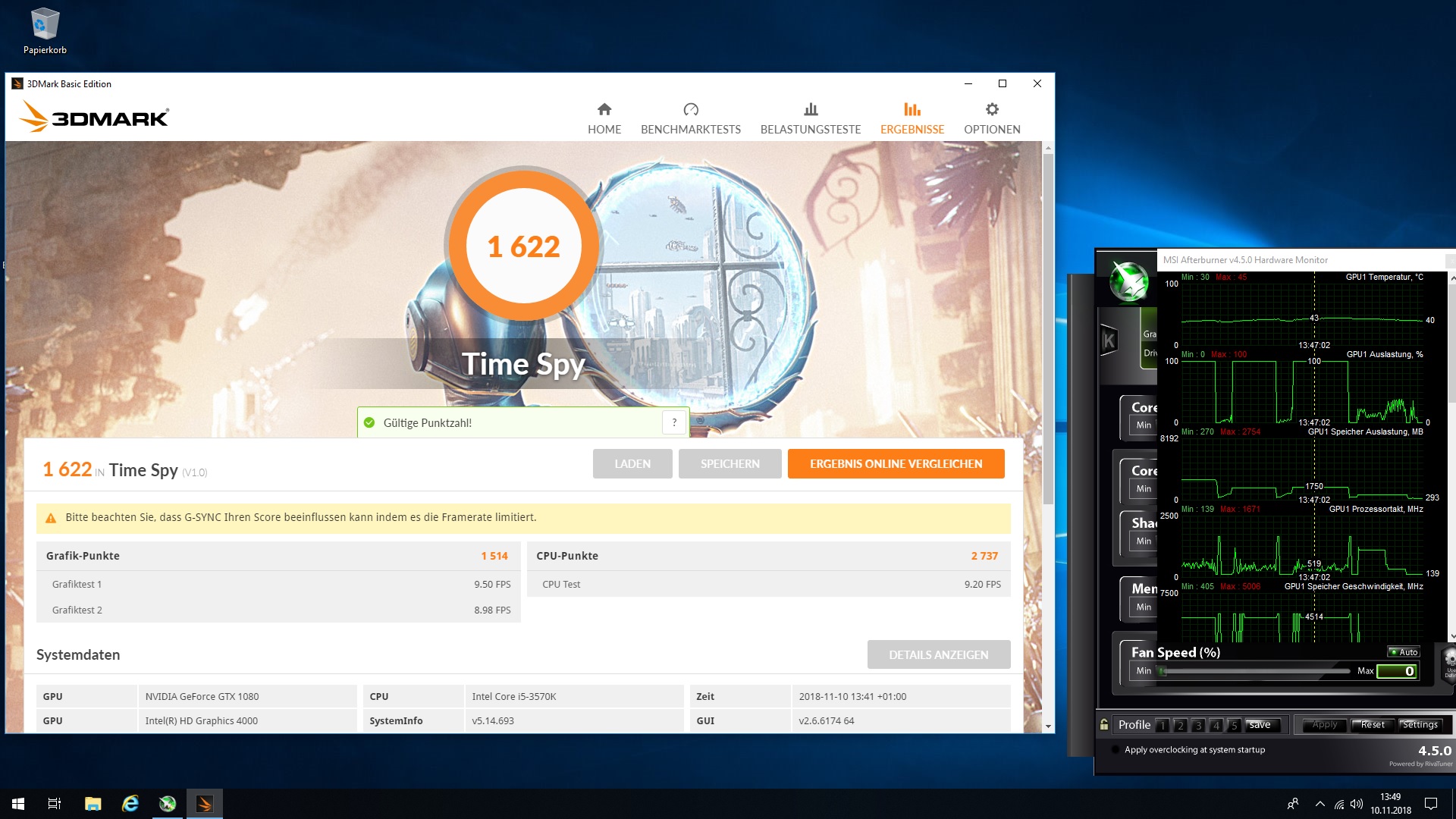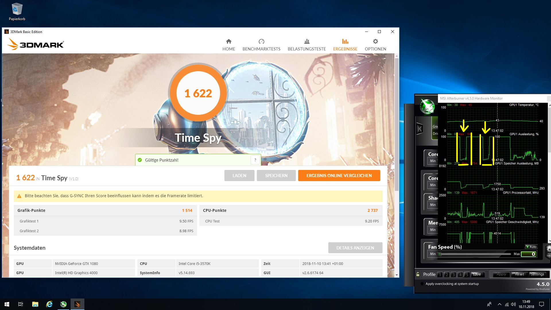1. Die Werte [Grafikpunkte] sind für eine GTX 1080 viel zu niedrig, im Time Spy Benchmark komme ich mit OC, deutlich über 6000 Grafikpunkte. Auch die CPU Werte erscheinen mir zu gering für einen i7 7700K, ich komme da mit meinem i5 8600K@5,0 GHz auf über 7000 Punkte.