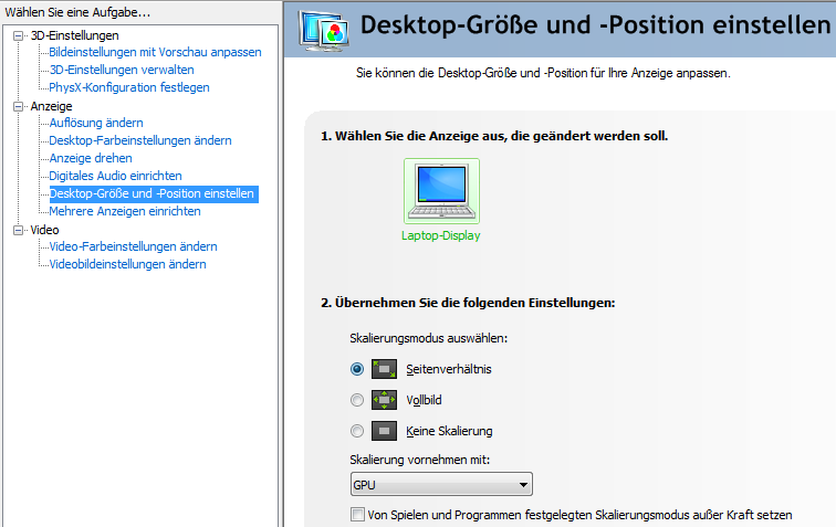 In der NVIDIA Systemsteuerung kann ich entweder keine Skalierung, Verzerrung oder beibehalten des Seitenverhältnisses mit schwarzen Rändern machen. Aber der gewünschte Effekt tritt nicht ein.