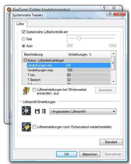 Ich möchte lediglich die 2D-Lüfterdrehzahl der GTX 260 auf 25% einstellen und natürlich unter Last die Lüftersteuerung der Karte verwenden.
