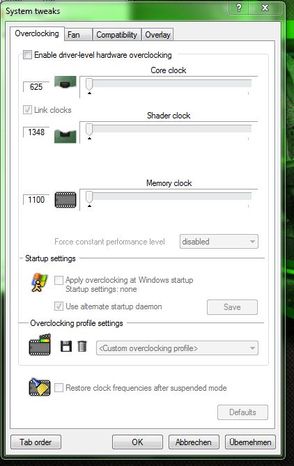 Und zwar habe ich eine Gtx 260. Ich habe einen screenshot vom OC Menü gemacht. Den werde ich natürlich noch einfügen.