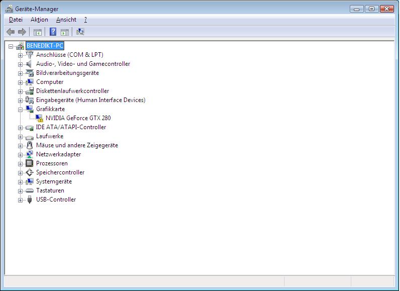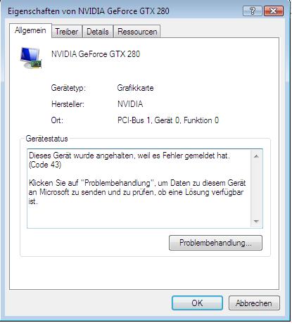 Nachdem ich mit meinem alten System bereits Probleme mit meiner GTX 280 hatte, habe ich jetzt Probleme mit den Treibern. Dies äußert sich dadurch, dass im Gerätemanager die Grafikkarte mit einem kleinen gelben Warndreieck versehen ist (Bild 1 im Anhang). Öffne ich nun die Eigenschaften der GTX 280, dann steht unter Gerätestatus (Bild 2 im Anhang):