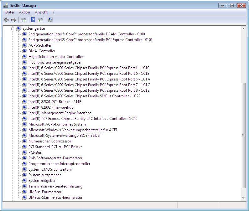 Das Problem tritt bei Windows 7 x64 & x86 und bei Windows Vista x86 auf. Nach einigem Recherchieren (Es gibt auch einen fast identischen, anderthalb Jahre alten Thread hier im Forum) scheint der Fehler durch einen noch "unter" dem Grafiktreiber liegenden Treiber (etwa der für die PCIe Schnittstelle) bedingt zu werden. Ich habe zunächst die dem Mainboard beiligenden Treiber und dann die aktuellsten Treiber von Intel (Chipset INF 9.2.0.1015) + das Intel Management Engine Interface probiert - immer der selbe Fehler. Momentan ist der Grafiktreiber 266.58 installiert, mit anderen tritt das Problem auch auf. Außerdem habe ich mal dxdiag laufen lassen: Dort wird mir unter Anzeige quasi nichts angezeigt; das einzig Seltsame ist, dass unter Anzeigemodus unter anderem 1Hz steht. Für den Fall, dass jemand ein konkrete Idee hat, welches Systemgerät den Fehler verursachen könnte, habe ich den Abschnitt im Gerätemanager als Bild (3) dem Anhang hinzugefügt.
