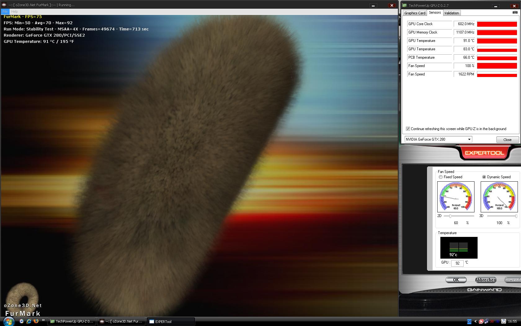 Ne spass beseite, habe eben Furmark mit 1680x1050 und 8xAA laufenlassen, und nach über 10min hing sie konstant bei 91°C. Denke mal ich hab eine "gute" erwischt, nu wird noch dat bios geflasht, und dann hab ich hoffentlich meine ruhe