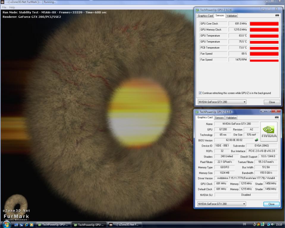 Das sind allerdings auch keine Vollast Temperaturen. Der Screenshot sollte gemacht werden, während Furmark läuft, die G200 Karten kühlen in den meisten Fällen sehr schnell ab, wenn sie den Performance Modus verlassen.