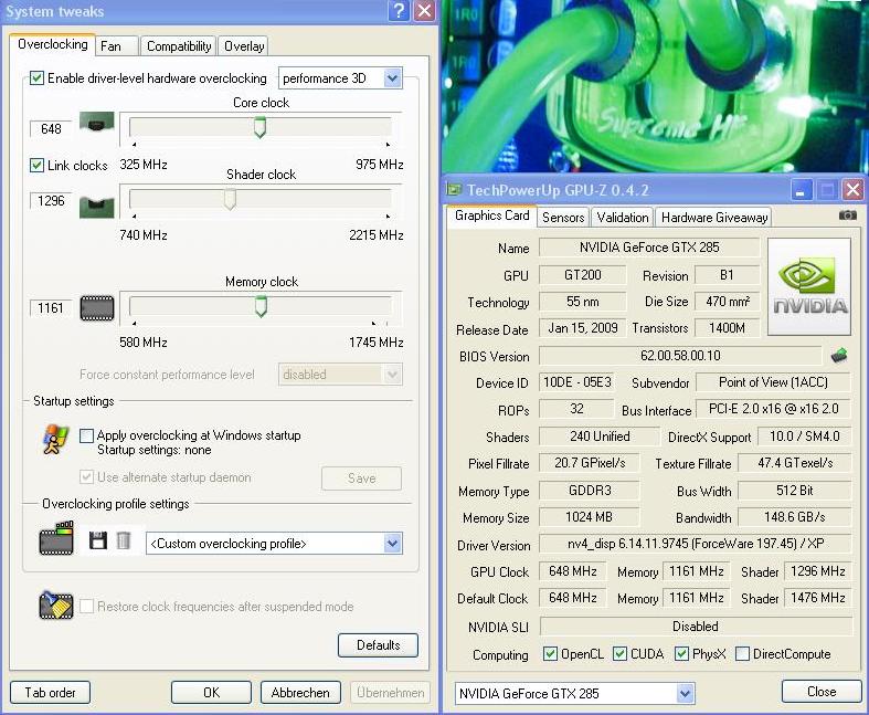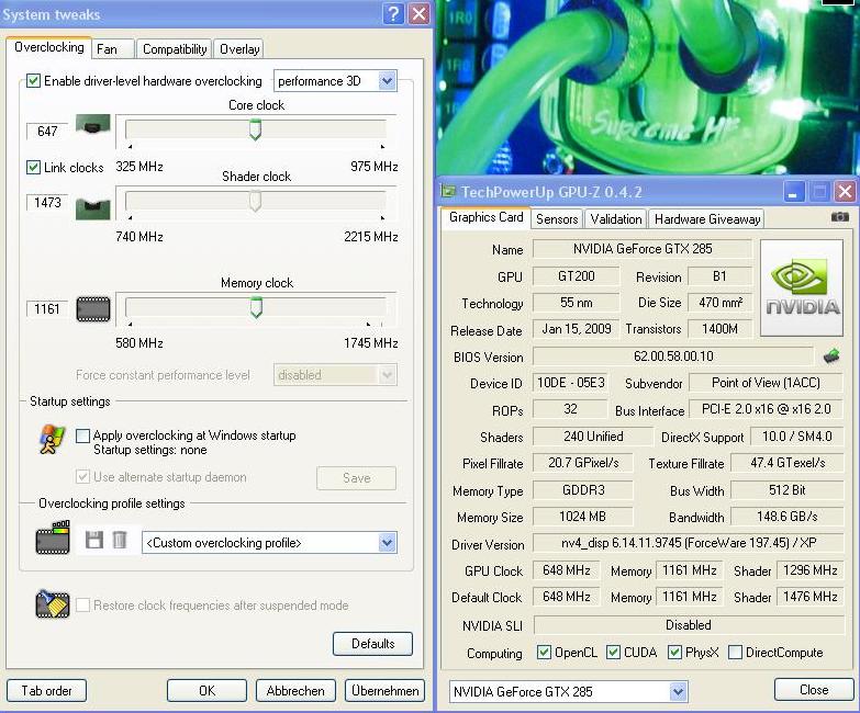 Laut Riva Tuner hat die Graka 1296 MHz Shader clock, also wenn die GPU von PoV wirklich so schwach gesetzt worden ist, dann wunderts mich nicht das wir mit der GTX 285 von PoV Problem mit 1478 MHz Shader bekommen, denn von 1296 bis 1478 MHz Shader ist einfach ein zu großer Sprung nach oben, und ohne extra Volts würde es die Karte niemals Schafen!