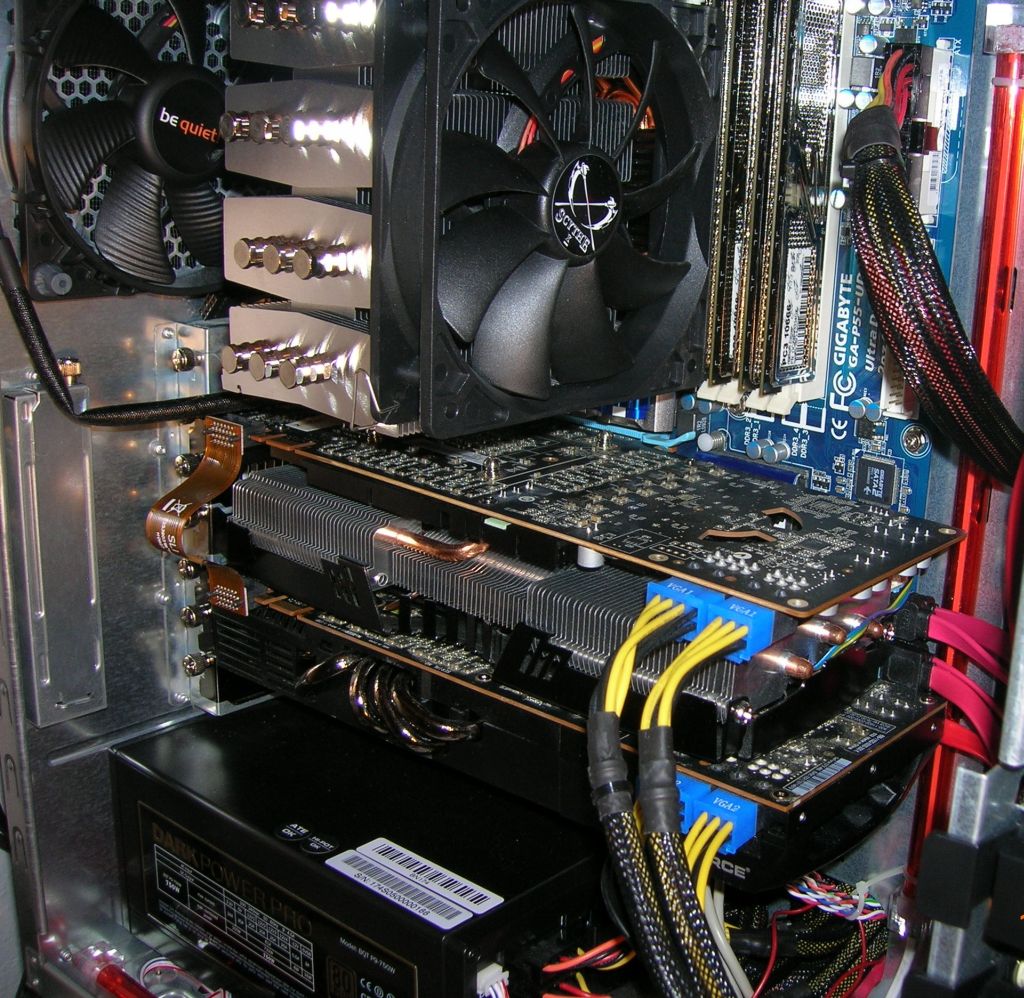 Als Stromquelle dient ein Bequiet P9-750 Watt welches alle Komponenten einschließlich der vorhandenen GTX 480 AMP! versorgt. Als Partnerkarte wurde eine RMA neue GTX 480 Point of View (Referenzkühlung) angeschafft.