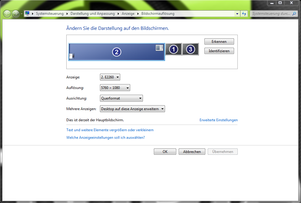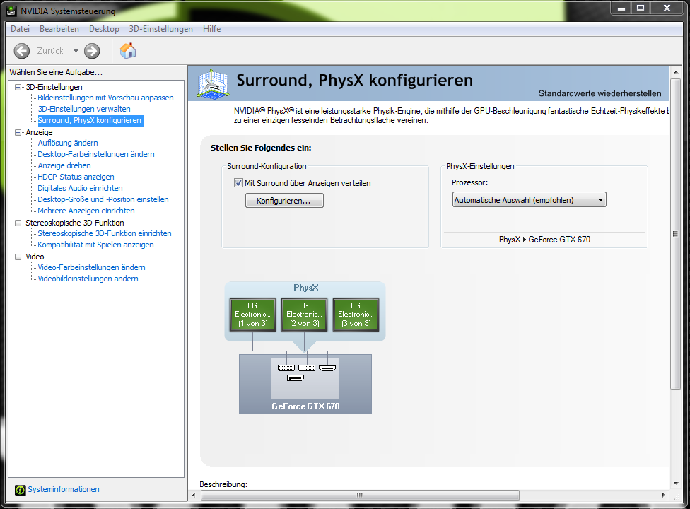 An meinem PC (siehe unten) wollte ich meine 3 Monitore anschliessen. Habe Nvidia 3D Surround normal eingerichtet (bin nicht blöd + bin technisch versiert, treiber aktuell, pc neu aufgesetzt usw usw). hat alles wunderbar geklapp. konnte sogar Furmark laufen lassen; beide Grafikkarten voll ausgelasted und beide schön mit der Temperatur schön hochgefahren, bis auf die kleine Tatsache dass die auflösung viel zu gering ist. mit meinen 3 monitoren (alle 1920 x 1080) sollte ich ja eigentlich auf 5760 x 1080 kommen doch ich kan NIRGENS etwas höheres als 3730 x 1028 einstellen. Ich kann keine spezielle auflösung mit Nvidia controll center einrichten.