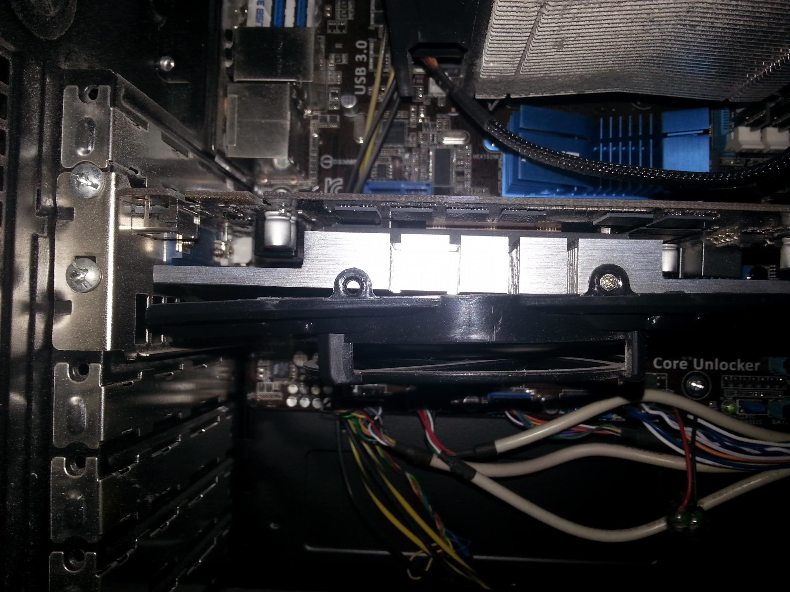 Vielleicht sollte ich noch dazusagen, dass schon vor einiger Zeit der Lüfter am Kühlkörper schrammte. Nach kurzer Untersuchung habe ich dann festgestellt, dass hier wohl ein Konstruktions- bzw. Herstellungsfehler vorliegt, da ich den Lüfter nicht mit allen 4, sondern nur mit 2 Schrauben festschrauben kann, damit er den Kühlkörper nicht mehr berührt, weil ich ihn dann leicht kippen konnte. Habe danach aber für mehrere Wochen die Temperatur überprüft, bei dieser war kein Unterschied festzustellen, woraufhin ich meine Lösung als stabil abgehakt habe