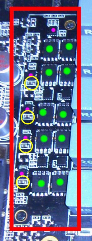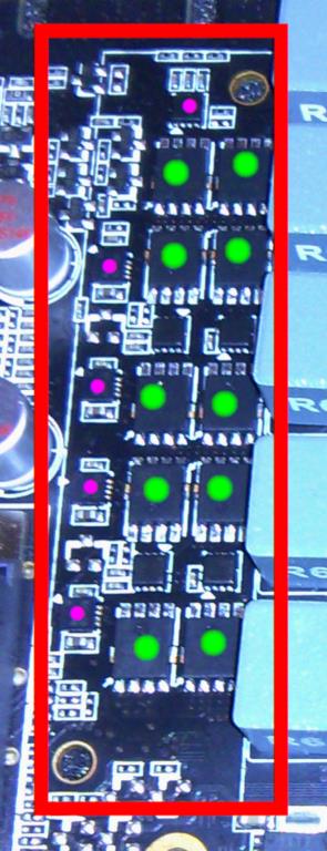 Bild 2: Die Zotac-Rippe deckte alle Elemente ab, die einen rosa oder grünen Punkt haben. Muss ich alle wieder abdecken und reicht es, wenn die von mir grün gekennzeichneten eine Rippe bekommen? Und was ich mit den kleinen "Dingen" zwischen den grün gekennzeichneten Wandlern? Sollten die auch abgedeckt werden?