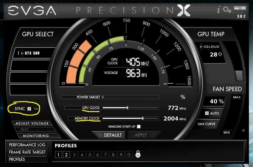 Habe schon seit einiger Zeit den nachfolger 3.0.2 drauf. Und interessanter Weise kann ich nicht Synchron den Memory und GPU Clock verstellen? Geht das nicht mehr. Weiter geht bei mir nicht das ich Profile anlegen und speichern kann. Hat da wer Rat und kann mir jemand genau erklären wie man das macht? Karte ist eine EVGA GTX 580