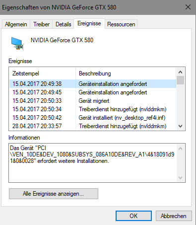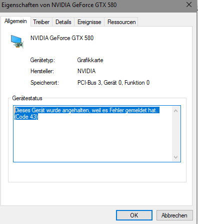 ich habe heute nur um was zu Testen einen Ram-Riegel herausgezogen und wieder eingesteckt.Davor ging meine Grafikkarte gut und ohne Probleme.Nachdem ich dan wieder mein PC startete, wird mir angezeigt,dass mein Monitor an keine GPU von NVidia angeschlossen ist.Der Geräte-Manager sagt: ''Dieses Gerät wurde angehalten, weil es Fehler gemeldet hat. (Code 43)''.