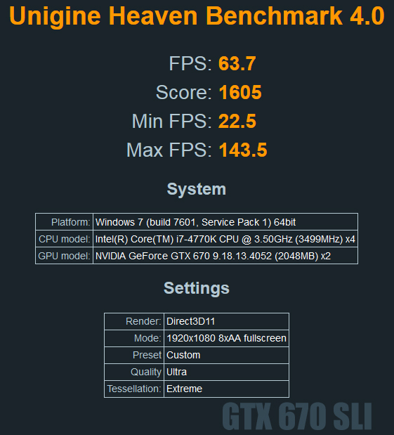 Du darfst mit nem GTX 670 SLI nicht zu viel erwarten, aber mit ner GTX 780 auch mit ti kannst du mit normalen Ingame-Settings gut mit halten - viel Spaß