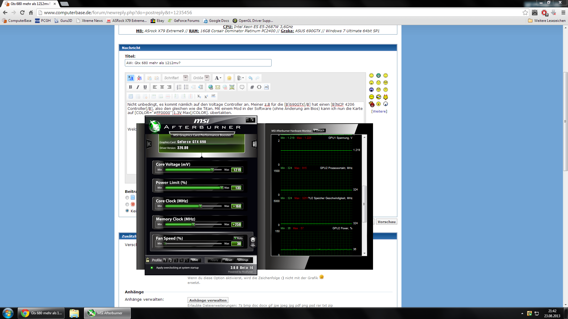 Der offizielle TDP einer 680 von NV mit 195W angegeben. Bezogen auf den Baseclock(Turbo) in der Referenz etwa 1100Mhz mit 0,987V . Meine 680 läuft mit Bord Power 132% 1,175V bei 1200/1300MHz(Turbo) was etwa max 230-240W entsprechen würde.Mit über 1,2V wären das dann mehr als 260W! Glaube die wenigsten 680 haben mehr als 2 6Pin Anschlüsse wo dann noch etwas mehr gehen sollte bei 6Pin ist bei 225W +- eh Schluss egal was Du für ein Bios flashst.
