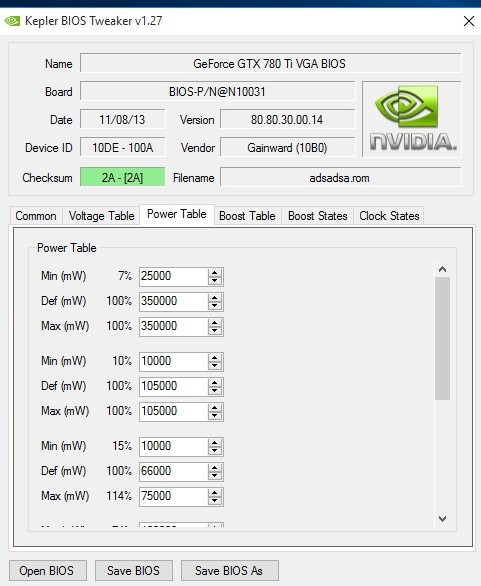 Zur Verdeutlichung vergleich einfach mal dein und mein Bios und schau dir bei Boost Table an in welcher Stufe die 1189 Mhz stehen. Klick dann rüber auf Voltage Table und schau welche Volt dort eingetragen ist. Und dann überlege ob die Karte die Stufe überhaupt anlegen kann.