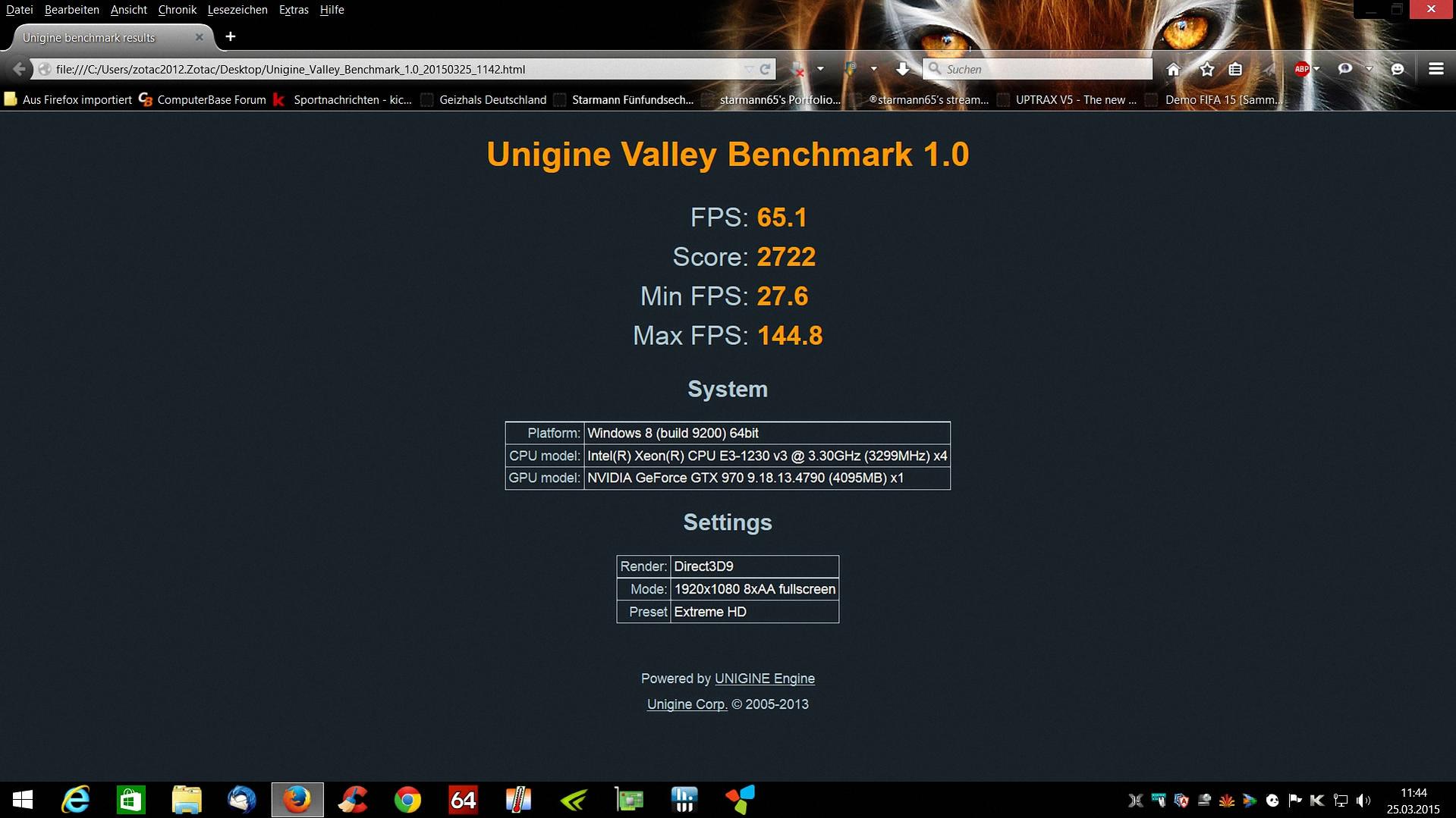 Ich habe jetzt mal mit Boost-Takt 1552 MHz und Speichertakt 1898 MHz den Unigine Valley Benchmark im DirectX 9 Modus durchlaufen lassen und muß sagen das Ergebnis ist ganz OK.