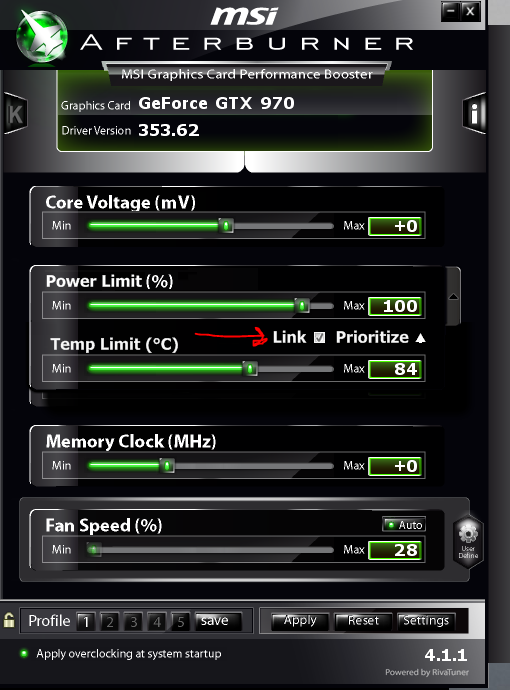 Wie kann man eigentlich das Runtertakten verhindern? Bei ca. 70 Grad taktet sich das Teil um gute 15 MHZ runter trotz Temp. Limit 91 und Power Limit 112%! Das Teil würde doch locker 80-85 Grad aushalten wie jede Graka. Kann ich dieses Runtertakten noch anders verhindern? Nutze MSI Afterburner 4.1.