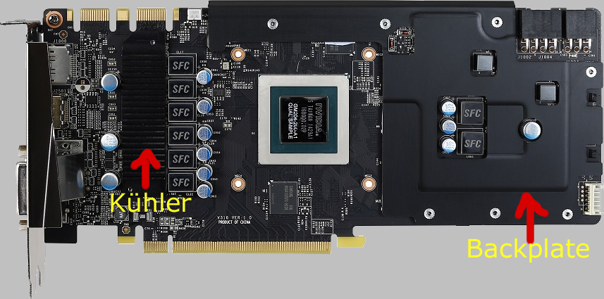 Was Du meinst ist bestimmt eine Backplate auf der Rückseite des PCB, wie sie z.B. die GTX 970 Gigabyte hat, allerdings dient diese meist nur zur Stabilität und Optik und nicht wirklich zur Kühlung. Wenn ich bei meiner MSI übertakte mache ich das nur mit Powertarget und ohne Spannungserhöhung, wenn ich den Speicher mit übertakte gehe ich beim Core Clock max. bis +200 MHz [1314 MHz/ Boost 1541 MHz] und der Speicher geht bei meiner ohne Probleme +600 MHz [ 2053 MHz /4104 MHz im Afterburner]. Beim Speicher übertakten sollte man vorsichtig sein, da es hier große Unterschiede gibt, gut übertakten lassen sich GDDR5 Speicher von Samsung und Elpida, der Hynix Speicher zickt schon mal gerne rum. Im GPU-z kannst Du unter Memory Type den Hersteller sehen, dort sind auch alle anderen wichtigen Daten hinterlegt. Wichtig ist beim übertakten, solltest Du irgendwelche Artefakte /Pixelfehler oder ähnliches haben, dann solltest Du den Benchmark abbrechen und runter takten, auch solltest Du Dir immer die OSD Werte Deiner Grafikkarte im Game oder Benchmark beim übertakten anzeigen lassen, was mit dem MSI Afterburner kein Problem ist.