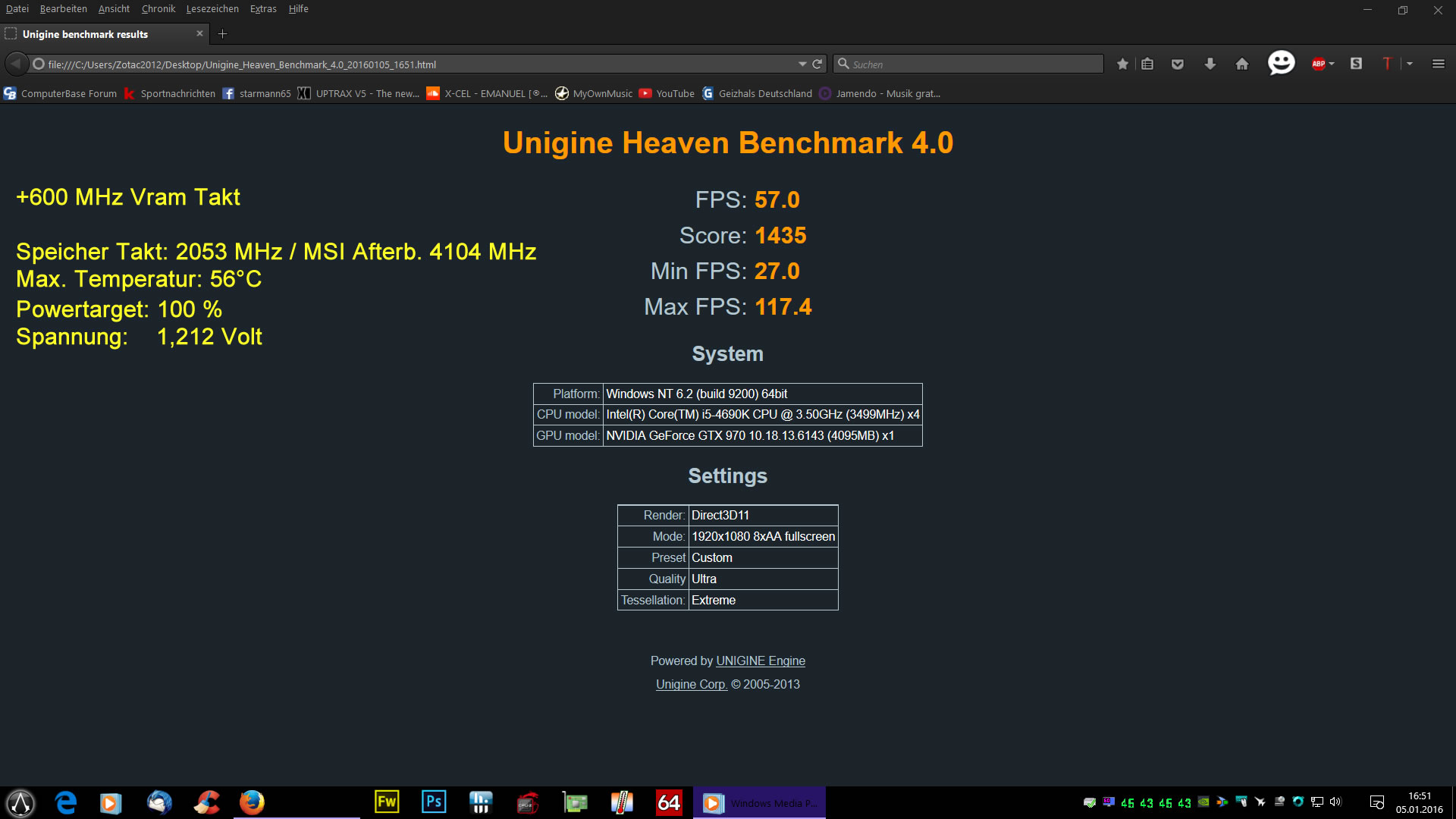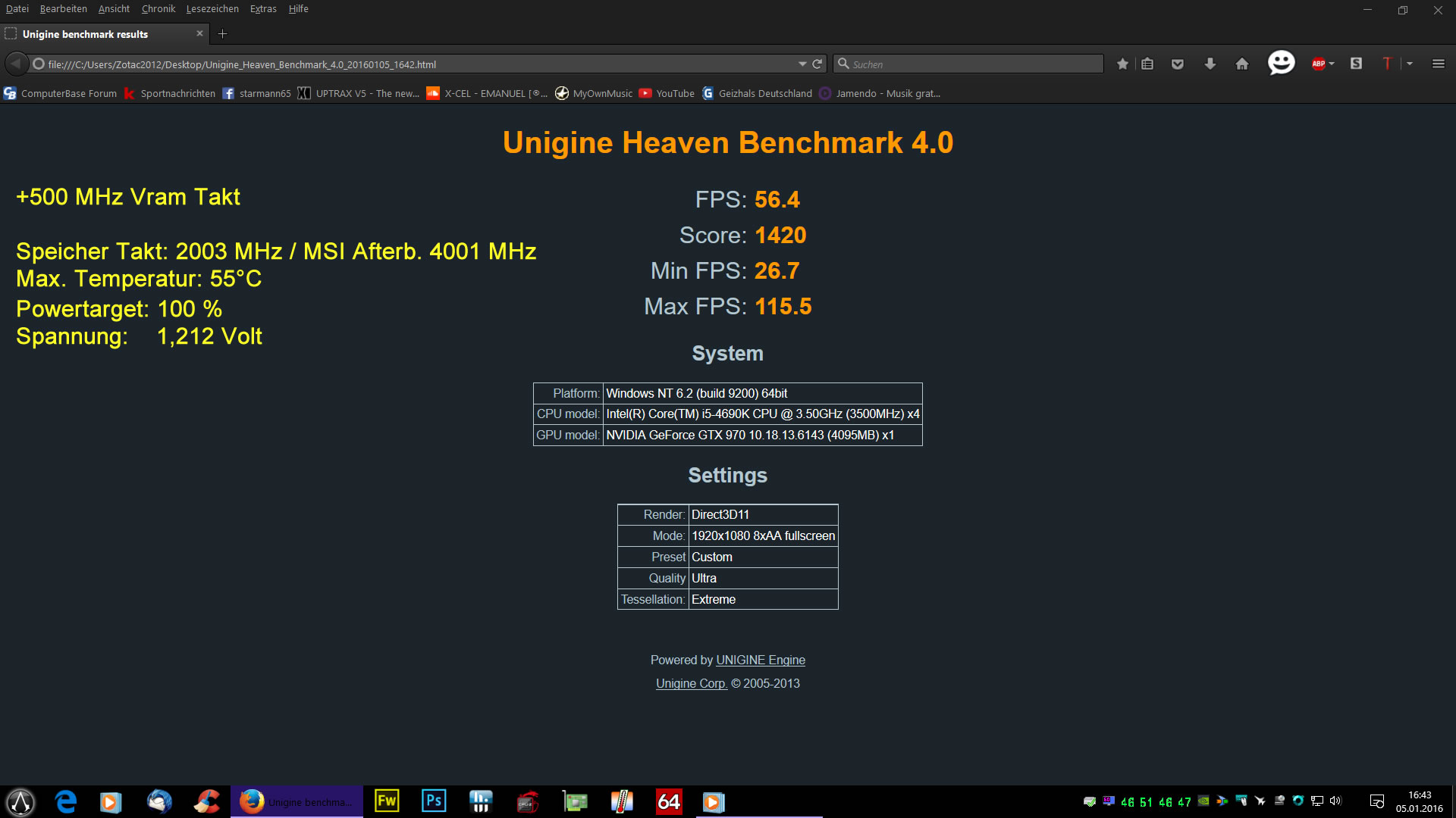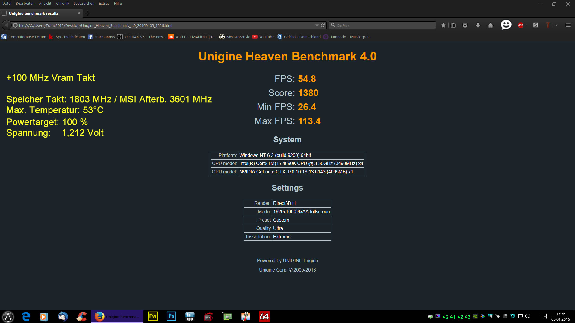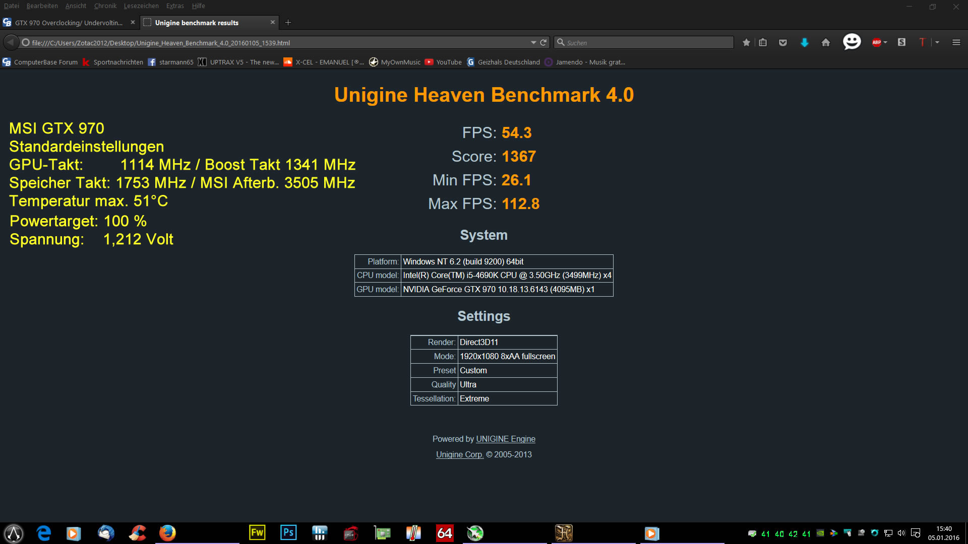 So ich habe hier auch mal mit Unigine Heaven 4.0 Extrem getestet, zunächst mit den Standardeinstellungen meiner MSI GTX 970 Gaming. Dann habe ich jeweils den Speichertakt [Vram] um 100 MHz erhöht bis +700 MHz, alle anderen Einstellungen habe ich so gelassen wie sie Standardmäßig vorgegeben sind [Werte stehen in den Screens]. Auflösung 1920X1080 Vollbild Modus !!!