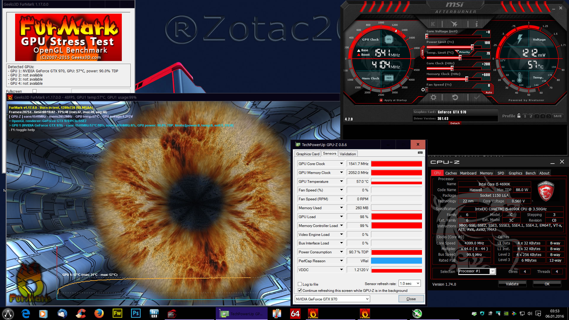 Damit läuft meine MSI GTX 970 ohne runter zu Takten und ohne irgendwelche VRam Fehler und das nach 10.Minuten bei einer Temperatur von 57°C, das finde ich sind schon ganz ordentliche Werte.