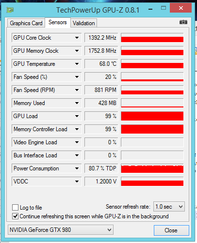 Auf dem Screenshot nach den 15 Minuten Benchmark-Test sieht mein einen GPU Core Clock von 1392.2 MHz.
