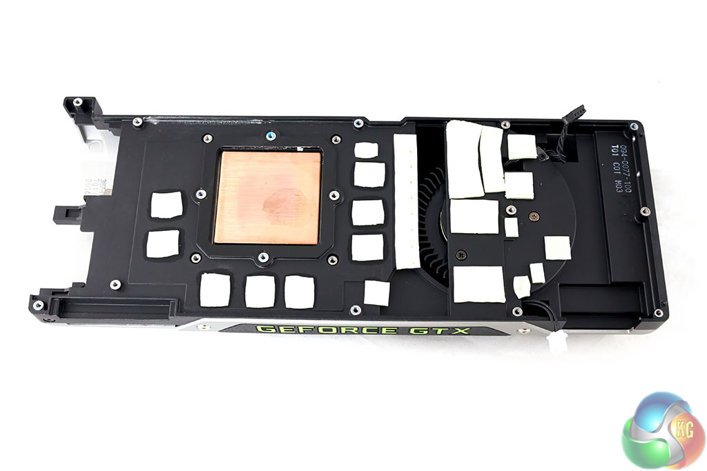 hier der vrm-kühler, der auch noch etwas vram kühlt. die platte ist unten glatt, es wird einfach über ein grosses wärmeleitpad kontakt hergestellt. es sind aber 3 cutouts für komponenten vorhanden, ich weis nicht ob die auf einer ti auch da sind oder nicht...