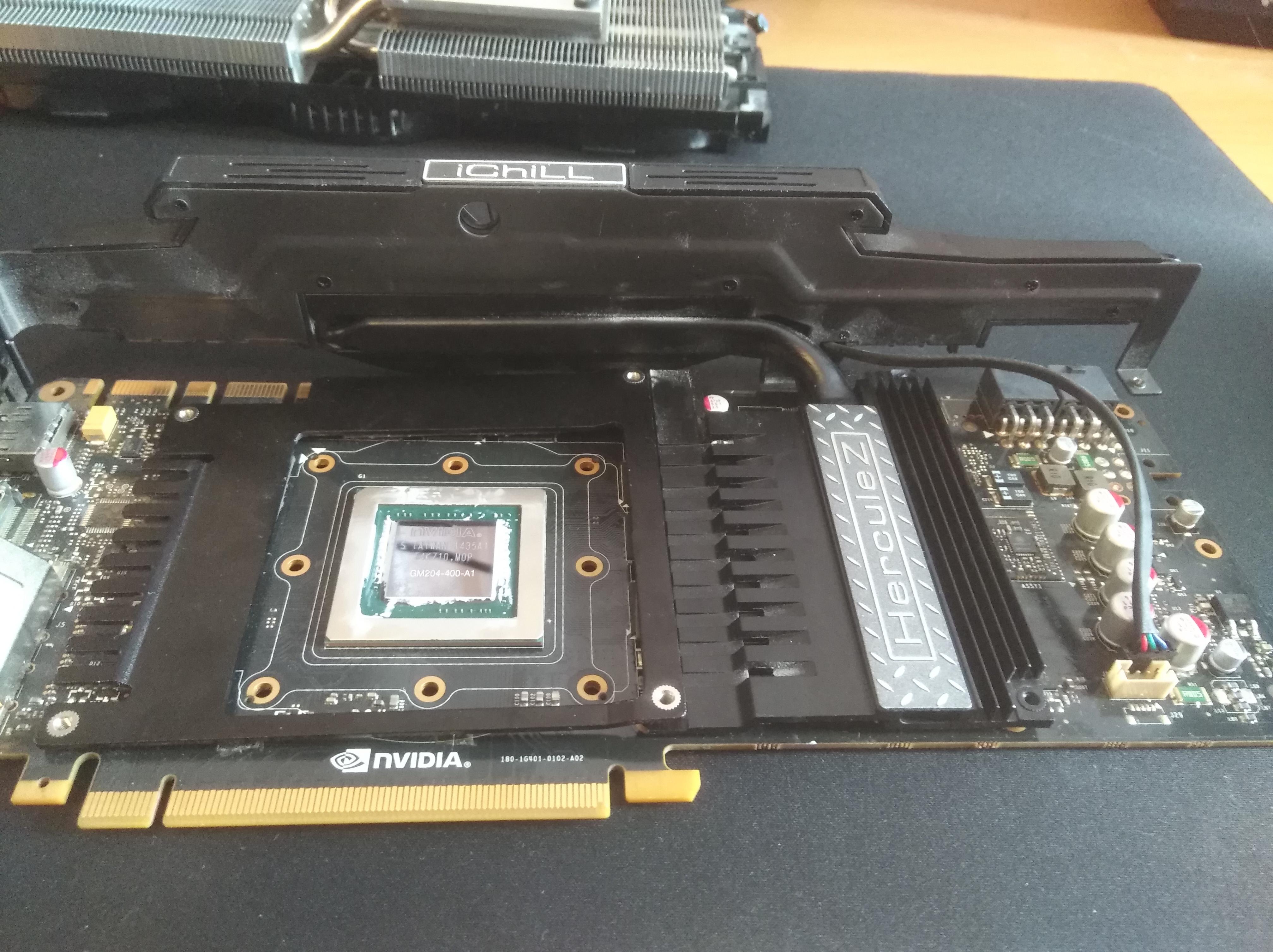 Nun ist die situation so: ich habe die alte 980 airboss x4 noch, welche einen extrem leistungsfähigen kühler mit einem gtx 980 referenz pcb kombiniert. gibt es eine möglichkeit, den kühler von der 980 auf das pcb der ti zu schrauben? sind die referenzkühler von 980 und 980ti überhaupt verschieden? ich habe leider nur wenige bilder des kühlsystems der 980ti airboss gefunden, soweit ich das erkennen kann gibt es kaum unterschiede. der GPU-kühlkörper sollte ja so oder so passen, die schrauben haben ja das gleiche spacing und die baseplate ist locker gross genug für den gm200, ich frage mich nur ob vram und VRM-kühlung auch wieder verwendbar sind oder ob ich das mit kleinen alukühlkörperchen lösen muss.