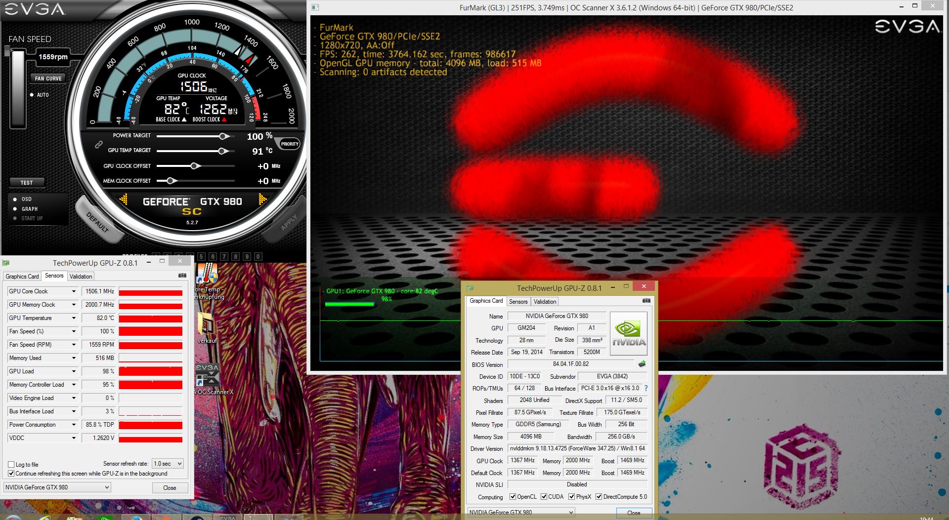 PrecisionX 16 Settings: Power Target 120%, GPU Temp 89, GPU Clock +124 (=1390), Mem Clock +250 (=4005)