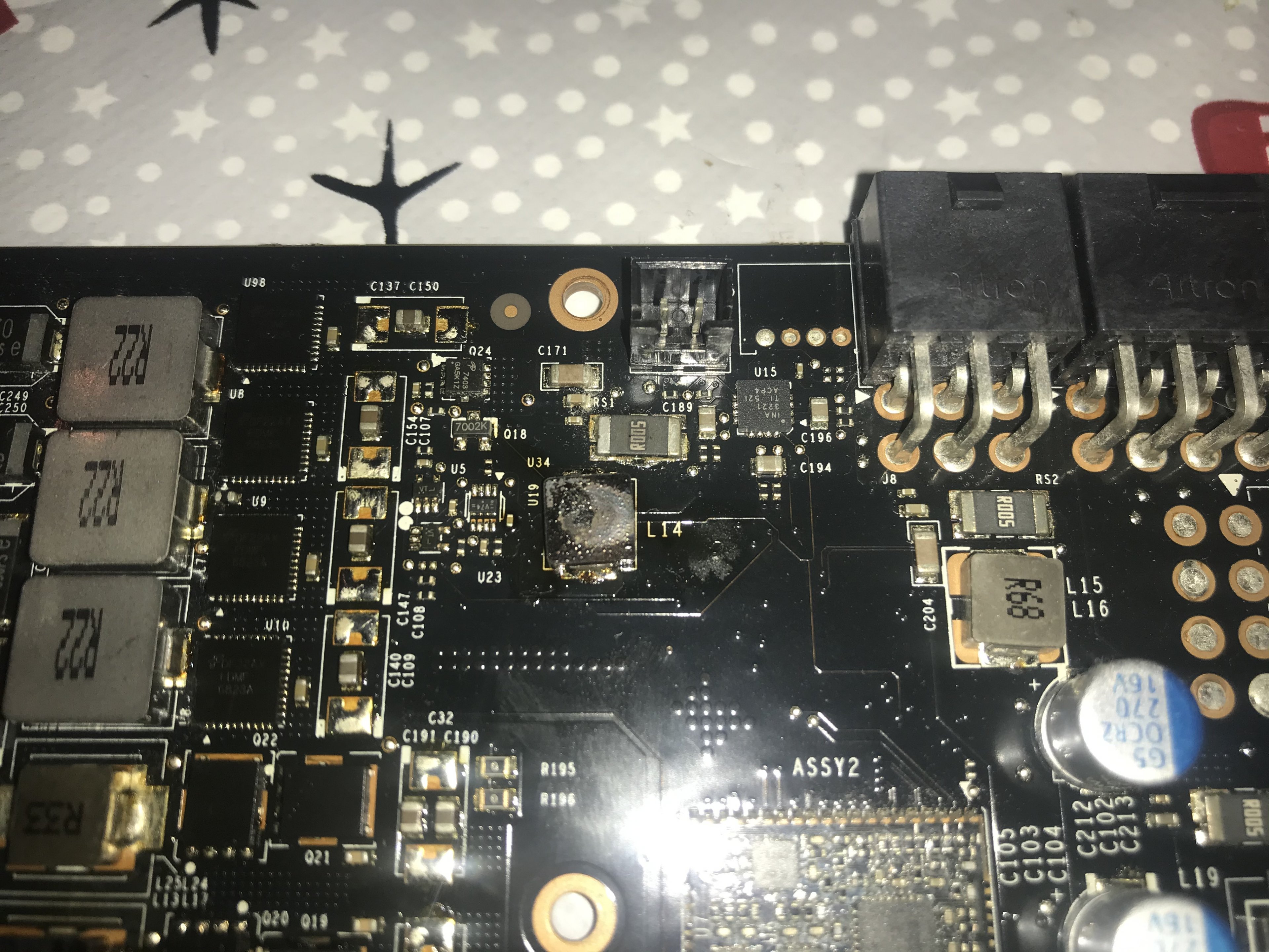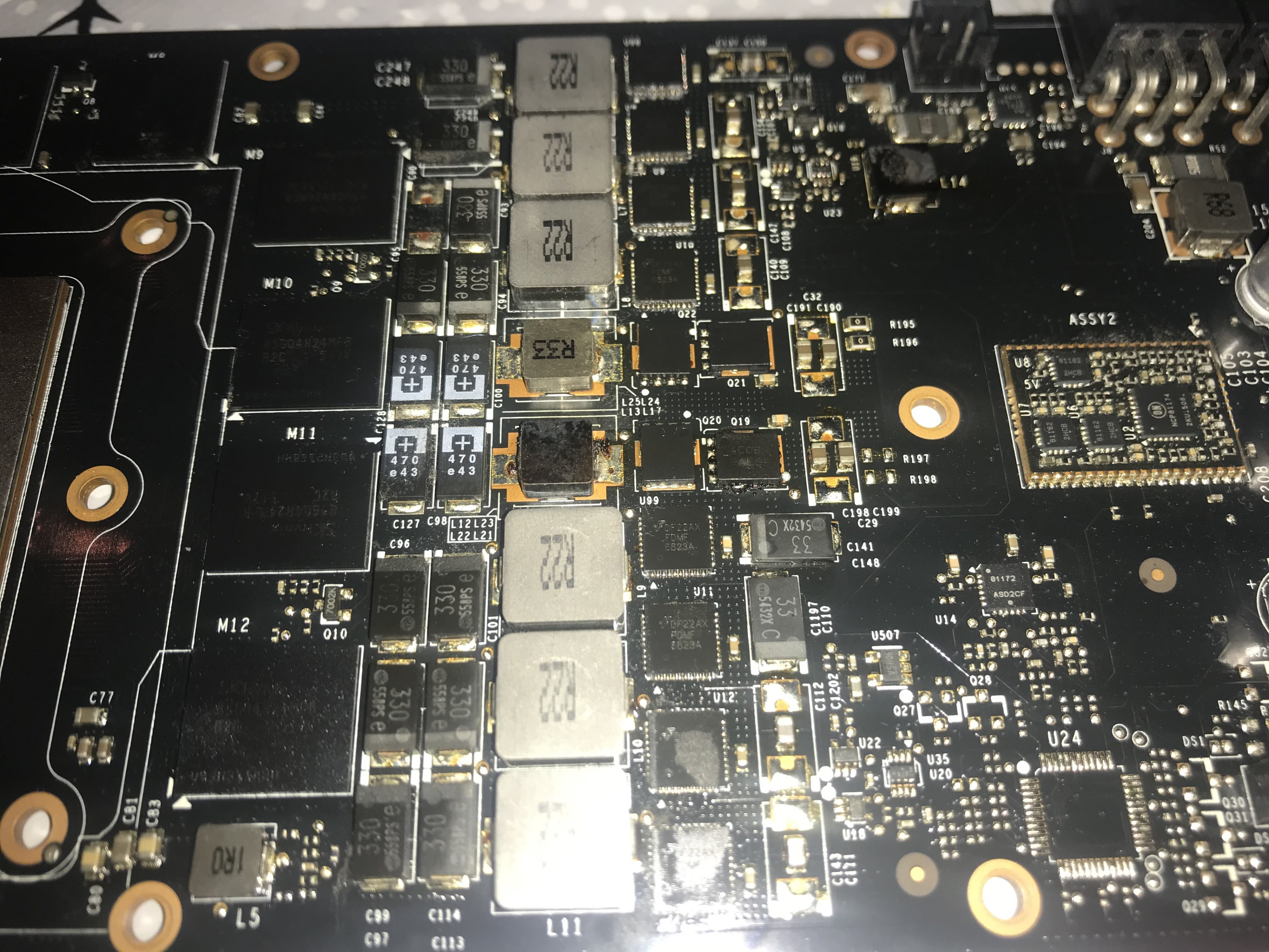 ich habe eine Grafikkarte defekt gekauft, als ich sie öffnete sind mir zwei Spannungswandler? aufgefallen die anscheinend verbrannt sind (siehe Bilder). Ich stelle mir jetzt die Frage ob man diese einfach austauschen kann oder ob wahrscheinlich noch mehr Bauteile hinüber sind. Beim ersten Bild, der zweite Baustein neben dem defekten Spannungwandler sieht auch nicht mehr so gut aus, da sich dieser an einer Stelle ein bisschen aufgewölbt hat.