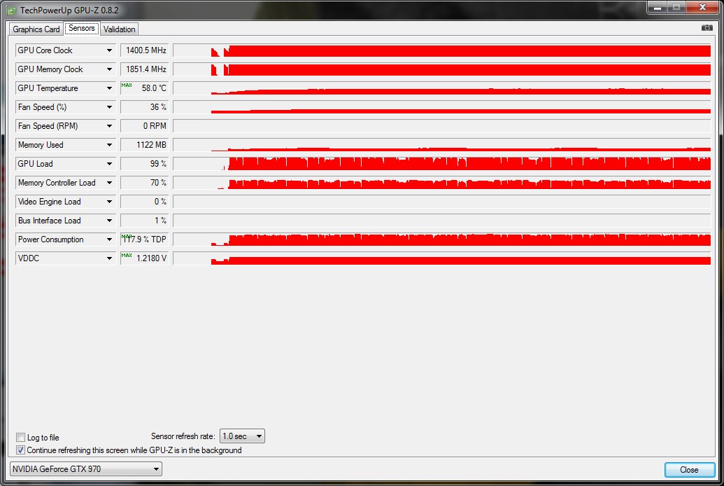 Jetzt nur das powertarget BIOS drauf und wieder OC per MSI AB - mit selben Volt und Takt - es entsteht beim Takt der GPU wieder eine GERADE