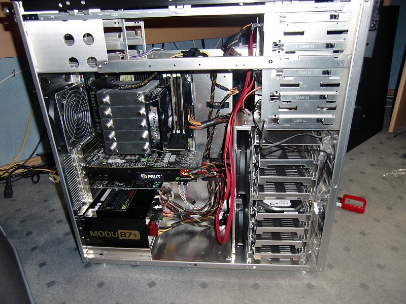 Falls sich jemand über die Zwischenlüfter wundert, ist ein Lian Li B70 Gehäuse, die Halterung stammt aus einem Lian Li A70B und wurden etwas angepasst, damit die passt und mit 140mm Lüftern mit 120mm Bohrung den vorderen angeglichen. Auf dem ersten Bild war ich noch nicht ganz fertig, da fehlen noch die Winkel, musste ich selber bauen.