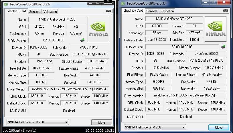 Bei meinen OC Versuchen ist mir im vergleich zu anderen aufgefallen das ich bei gleichem Takt mit der Texelfüllrate weit unter denen der anderen GTX260 216Core beitzer bin aber es kommt noch schlimmer ich bin sogar mit der Texelfüllrate unter dem Wert von GTX260 192Core besitzern.
