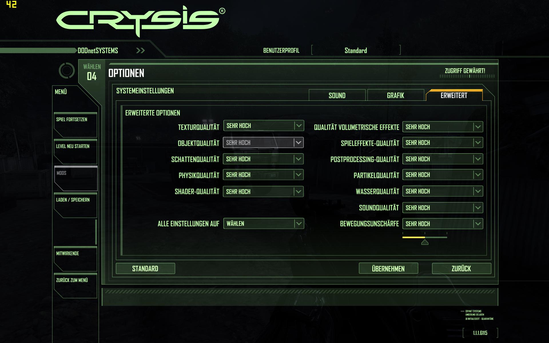 Mod : sind die mster master config, diese Laufen nomal nur mit hohen einstellungen, diese habe ich aber auf sehr hoch gesetzt, wenn ich den mod lösche sind die Frames genau so, bzw leicht besser weil der Mod mehr als das Very High braucht