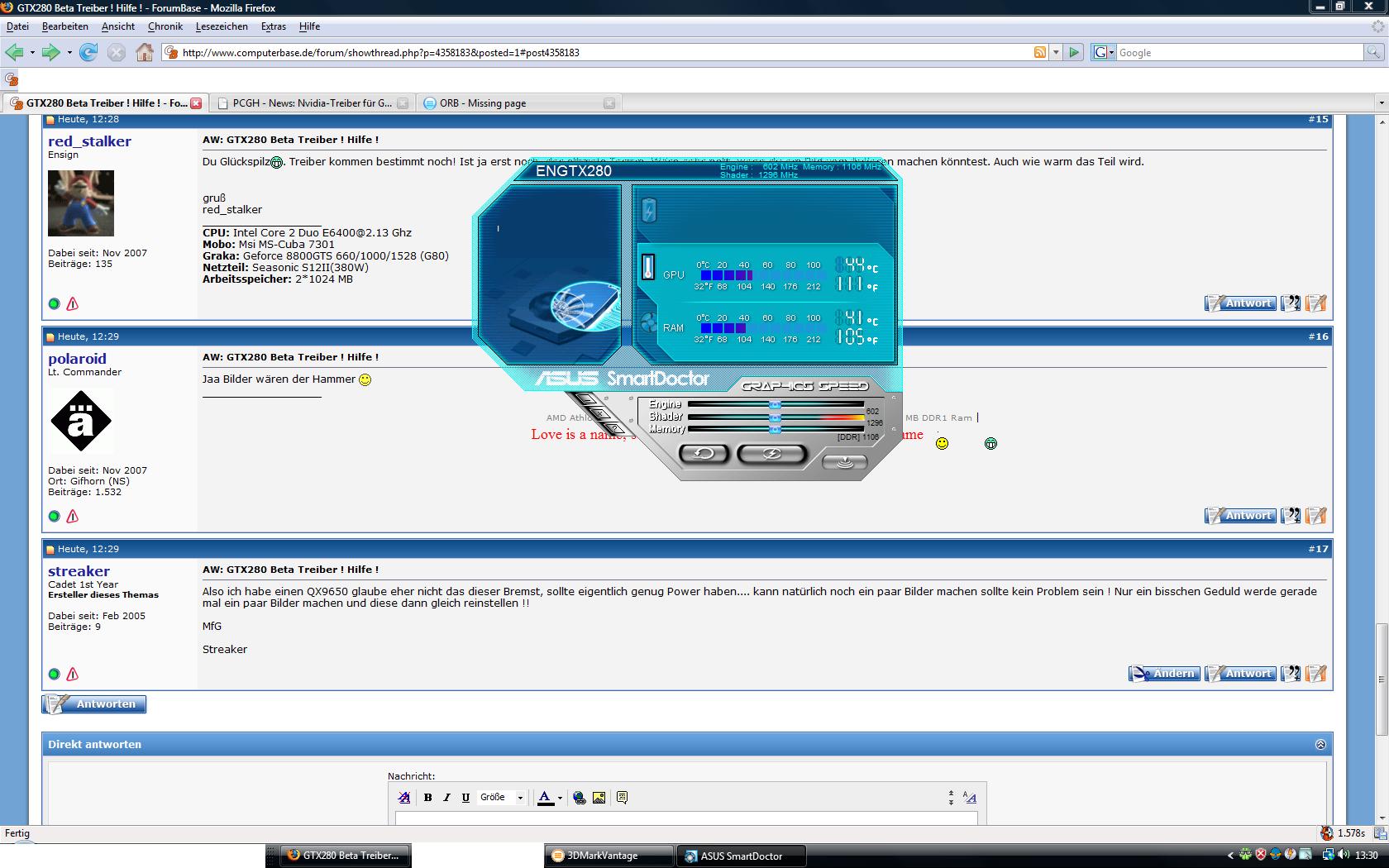 Also Games laufen bis jetzt alle Super flüssig, kein Stocken oder sonstiges. Race Driver Grid lief mit meiner 8800GT alles auf anschlag bis auf Multisampling auf 2x. Mit der GTX280 läuft es selbst auf 16x QCSAA einwandfrei! Crysis alles auf Hoch und 8x Anti.... läuft auch einwandfrei !