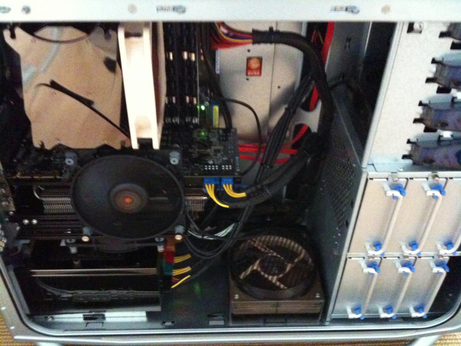 Der Umbau gestaltete sich vom reinen Kühlertausch her als vollkommen problemlos. Wie die meisten sicherlich wissen, verbleibt bei der GTX480 die Bodenplatte des Originalkühlers auf der Grafikkarte, so dass man sich keine weiteren Gedanken um die Kühlung der SpaWas etc. machen muss, ausreichende Belüftung vorausgesetzt. Die einzelnen Umbauschritte habe ich weiter unten per Photo festgehalten (leider etwas schwache Qualität).